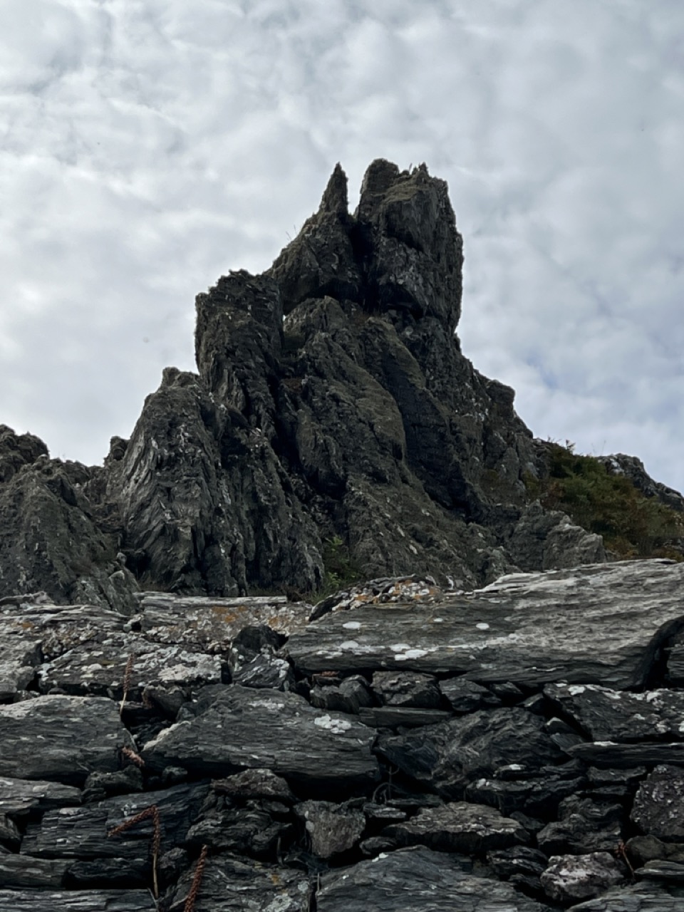 Als die nächste Leuchtturmbesichtigung beginnt, machen wir uns wieder auf dem Weg zum Parkplatz. Vorher beweist Marco allerdings noch vollen Körpereinsatz für das perfekte Foto und klettert die Felsen hinauf. Natürlich wäre es einfacher unseren Carlitto in die Luft zu schicken, aber das ist hier leider verboten. Es geht stetig bergauf. Am Parkplatz angekommen, gönnen wir uns einen Cappuccino und einen Brownie vom Barrista- Pferdeanhänger, setzen uns ins Gras und genießen die Aussicht auf Hallsands.
