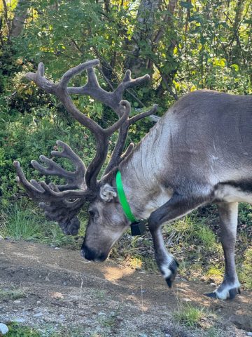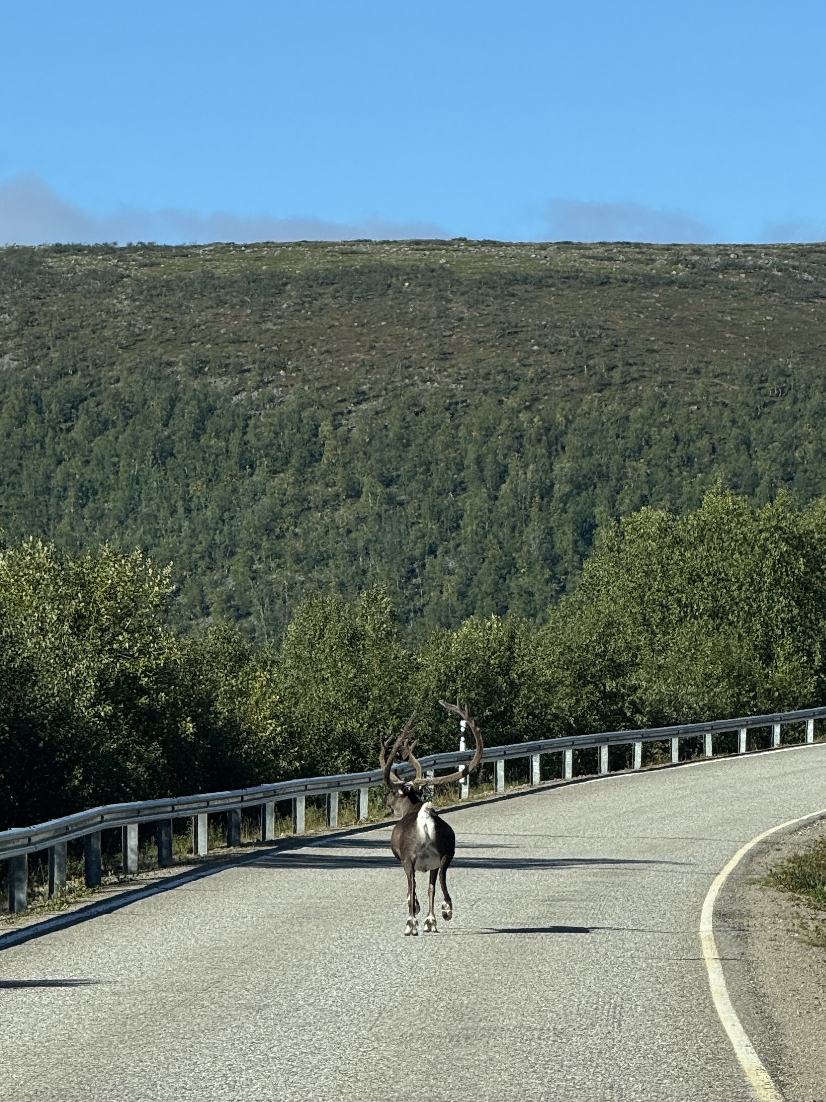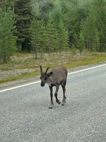 Auf der Strecke bis Utsjoki gibt es nur wunderschöne Landschaft und herrlichen Sonnenschein zu sehen. Die Vegetation verändert sich wieder und ist eine Mischung aus Kiefern, Birken, Gesteinsbrocken und Dünen. Und immer wieder öffnet sich der Blick auf die Tana. Ab und zu tanzt ein Rentier unentschlossen vor uns her, was zur allgemeinen Belustigung beiträgt!