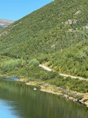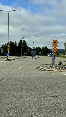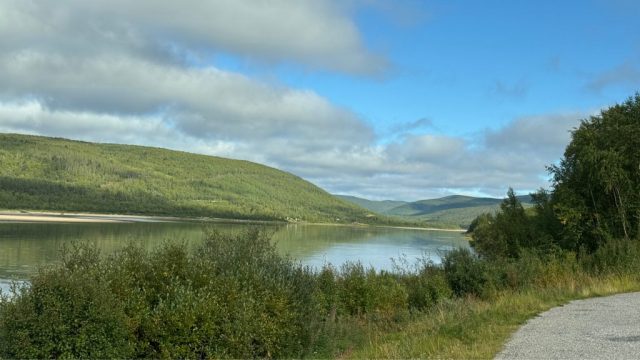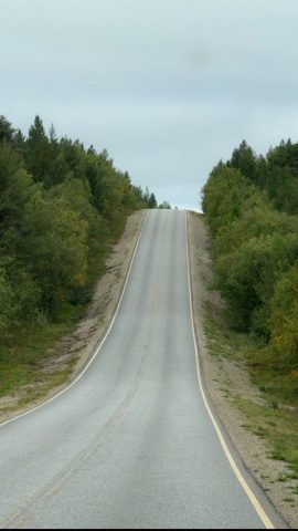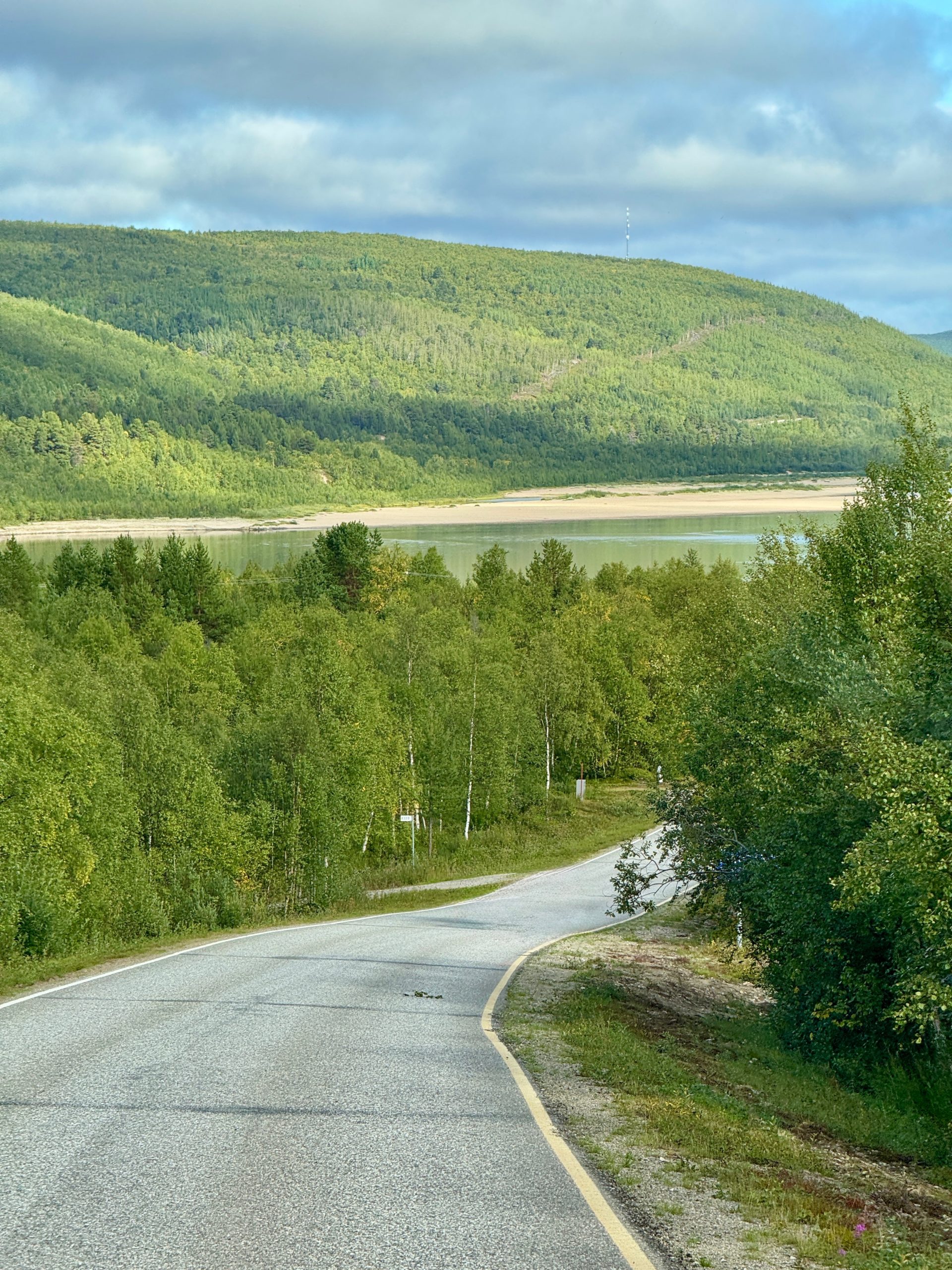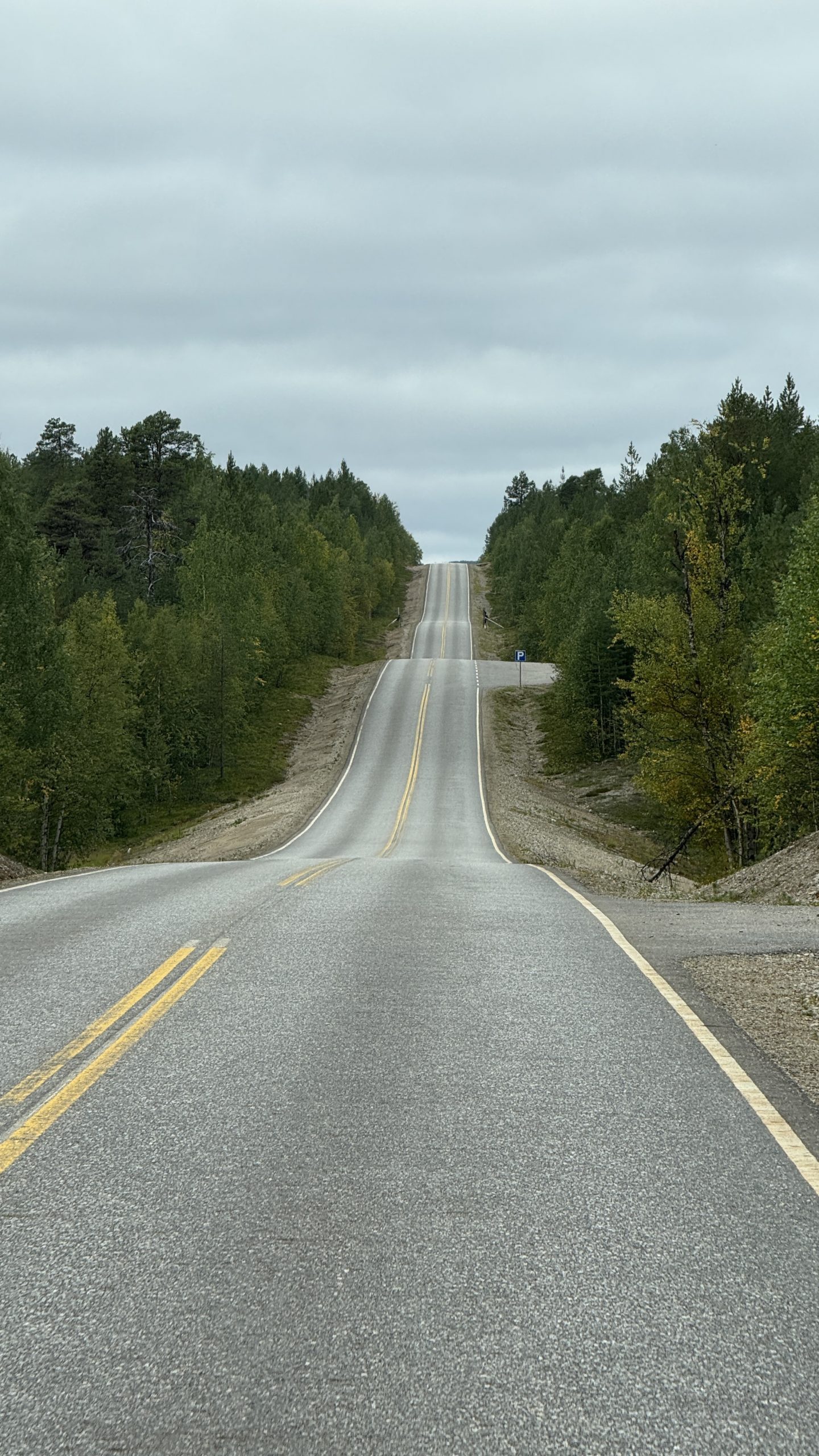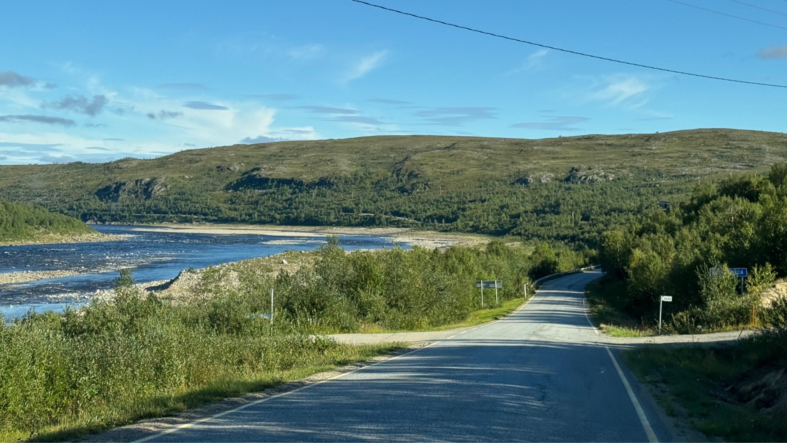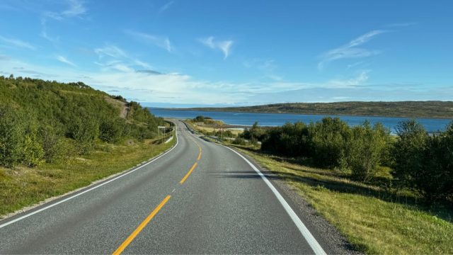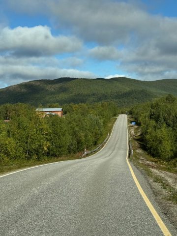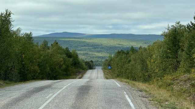 „Wer will noch mal, wer hat noch nicht!“ – wir haben das Gefühl in einer Achterbahn zu sitzen. Die ewig langen, gerade Straßen sind wir aus Lappland mittlerweile gewohnt. Aber das hier erinnert an eine Achterbahnfahrt. Es geht hoch und runter, hoch und runter, steil bergab und steil bergauf. Es fehlt nur noch ein Looping. Ansonsten Grün, soweit das Auge reicht, durchsetzt mit kleinen Seen. Irgendwann erscheinen die ersten Berge am Horizont, bevor es runter nach Karigasniemi geht.
