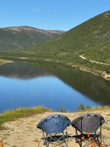 Dort biegen wir 200m vor der norwegischen Grenze rechts ab und fahren am Tanaelva entlang, dem finnisch-norwegischen Grenzfluss, bis nach Utsjoki. Die Tanaelva erinnert an Rhein oder Mosel. Ein breiter Strom, der sich durch die Landschaft schlängelt. Wer gerne Lachs isst, hat hier die beste Möglichkeit sich ein Exemplar zu fangen. Denn die Tana ist einer der weltweit besten Fischgründe für Lachse. 36 kg wog das schwerste Exemplar, das 1929 in der Tana gefangen wurde. Wir haben keine Angel dabei. Aber eine Kaffeemaschine und als wir eine Bucht mit schöner Aussicht sehen, halten wir spontan an, packen unsere Stühle aus und genießen die Sonne und die traumhafte Aussicht. Der Himmel ist so blau, wie das Wasser der Tana. Wir sitzen fast neben der Straße, aber es herrscht absolute Ruhe- kein Auto, kein Motorrad. Wir könnten hier bleiben, aber das Fernweh (und der nicht vorhandene Zeitplan) lassen uns weiterziehen.