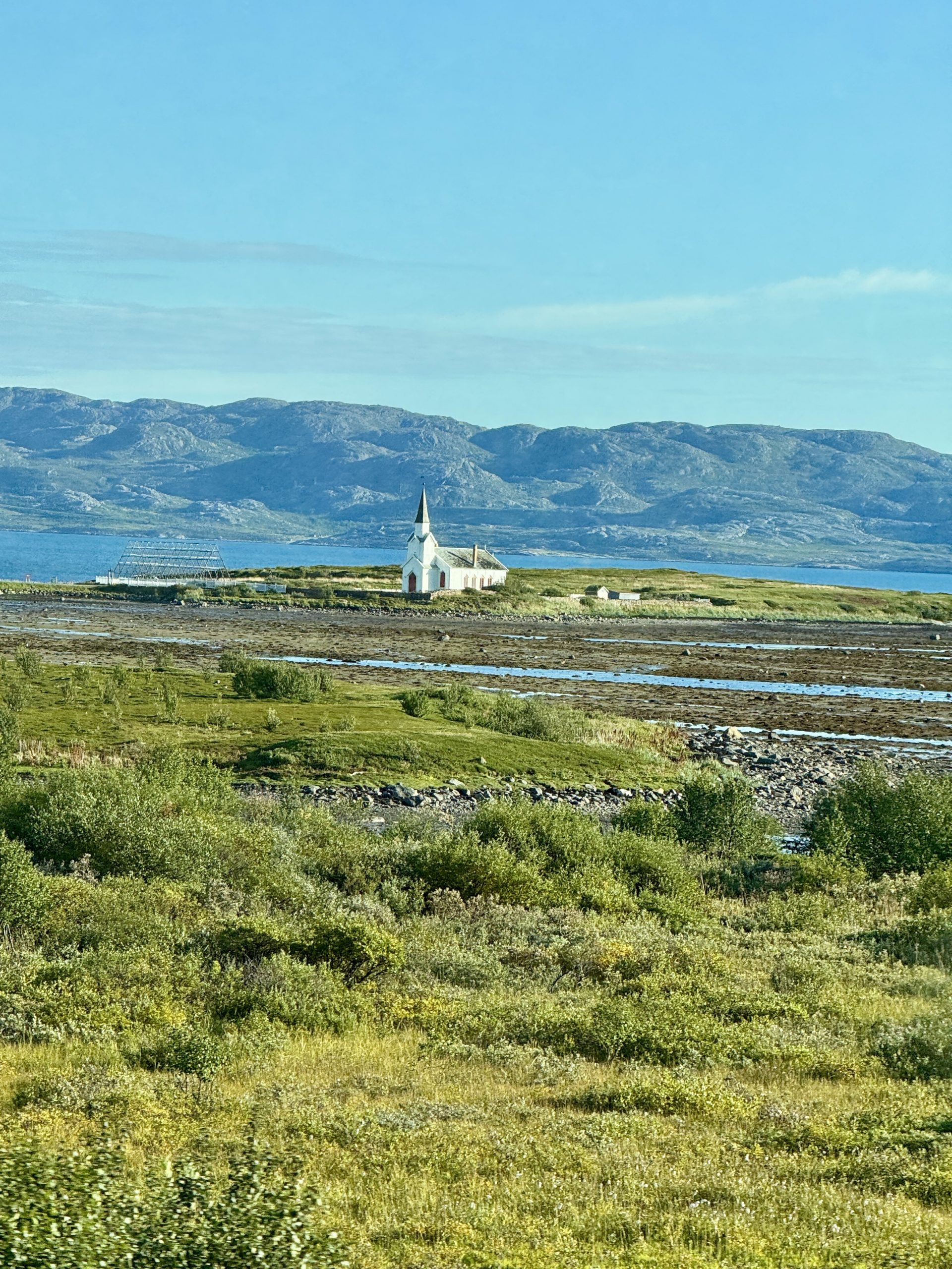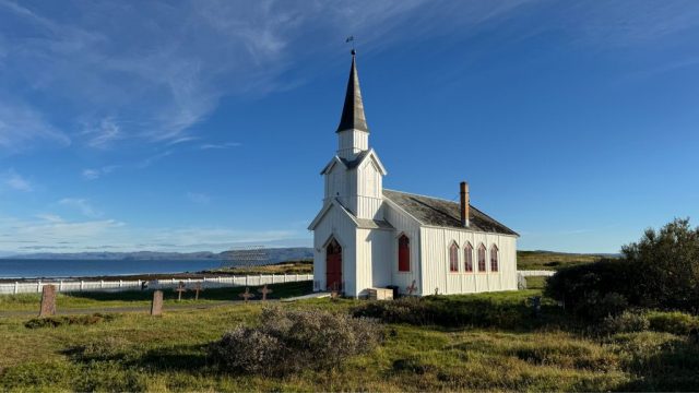 Varangerbotn ist das Tor zu Varangerhalbinsel: Der arktische Norden und die wohl schönste Küstenstraße des Nordens warten auf uns: Sonne, Meer, schroffe Felsen und bunte Holzhäuser. Am Straßenrand, Felder voller rot-leuchtender Blumen, die mir gänzlich unbekannt sind. Von weitem sehen wir die Nesseby Kirke, die auf einer kleinen Landzunge Wind und Wetter trotzt und auch den 2. Weltkrieg unbeschadet überstanden hat. Das kommt schon fast einem Wunder gleich, da hier fast kein Gebäude zu finden, das vor 1945 erbaut wurde. Die deutsche Wehrmacht hat auf Varanger, entsprechend der Taktik der „verbrannten Erde“, bei Ihrem Rückzug vor den Russen, keinen Stein auf dem anderen gelassen. Warum die Nesseby Kirke davon verschont blieb, ist bis heute ein Rätsel. Leider ist sie verschlossen und so machen wir uns nach ein paar Fotos wieder auf den Weg.
