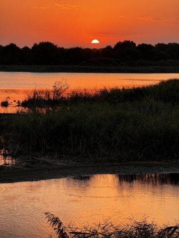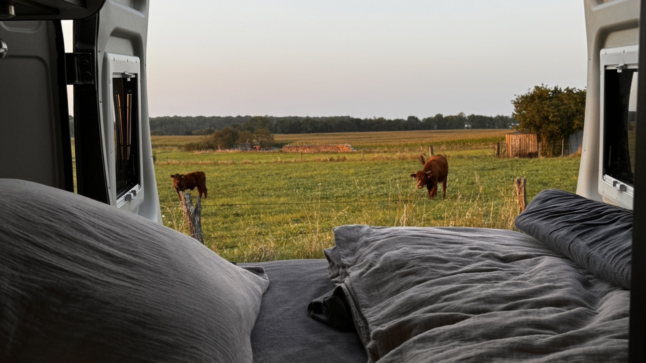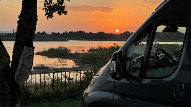 Nach einer Kaffeepause am See und vielen Kilometern, wird es langsam dunkel und wir werden zunehmend müder. Von zu Hause trennen uns noch ca. 150km. Sollen wir durchziehen und mitten in der Nacht ankommen? Oder übernachten wir noch mal und starten morgen erholt in die letzte, kurze Etappe? Wir entscheiden uns für letzteres und suchen einen Stellplatz: Der erste, den wir anfahren, liegt am Rande eines Wohngebiets neben einem Bauernhof. Wir fahren weiter und finden am Étang de Lachaussee ein ruhiges Plätzchen. Freistehen in Frankreich ist echt toll. Der Platz gehört zu einer Einrichtung für eingeschränkte Menschen und kostet nichts (ausser vielleicht einen Besuch im Restaurant oder einen Einkauf im angegliederten marché, Beides ist bei unserer Ankunft allerdings schon geschlossen).Wir sind froh diese Entscheidung getroffen zu haben, dann wir werden mit einem traumhaften Sonnenuntergang über dem See und etwas Wildlife belohnt. Und über eine weitere Nacht in Pablo freuen wir uns auch. Denn trotz einiger Unstimmigkeiten, ist der kleine Spanier uns irgendwie ans Herz gewachsen. Wir fallen also müde in unsere Kissen und träumen von weiteren Reisen, vielleicht irgendwann auch mit unserem eigenen Schneckenhaus.