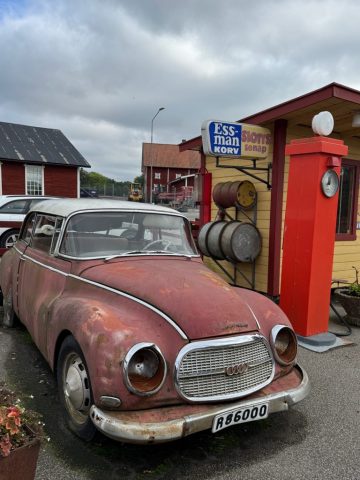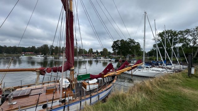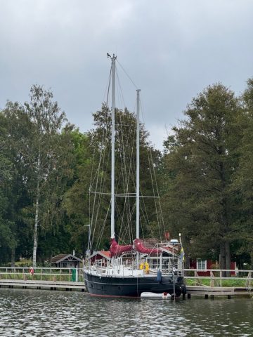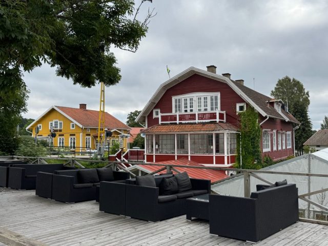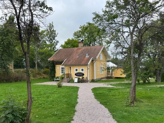 Für uns geht es nach einem gemütlichen Frühstück weiter in den Süden. Gestern haben wir die weitere Route besprochen: Um etwas Zeit- und Kilometerdruck aus den letzten Urlaubstagen rauszunehmen, werden wir statt den beiden Brücken, wieder die Fähre ab Trelleborg nach Rostock nehmen. Preislich kein großer Unterschied, zeitlich auch nicht viel, dafür aber etwas Erholung für Marco. Heute machen wir also nicht soviel Strecke. Bei Mariestad soll die Sonne wieder rauskommen, vielleicht finden wir ein gemütliches Café am See oder schlendern etwas durch die Stadt. Wir zuckeln also die 26 Richtung Süden entlang, passieren eine Baustelle nach der anderen und es wird Zeit für eine Pause. Sjötorp – „die Perle am Vänernsee“, wie die Schwedische Tourismusseite sie nennt, scheint uns ideal. Mehrere hundert Jahre Schiffsbau- und Fischereigeschichte, das Tor zum Göta Kanal mit seinen zahlreichen Schleusen, Souvenir- und Handwerkläden, gemütliche Cafés und Restaurants. Das ist doch genau das, was wir suchen.