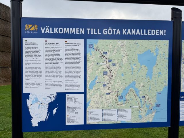 „Im Jahr 1810 begannen hier in Sjötorp unter Leitung von Baltzar von Platen die Grabungsarbeiten für den Bau des Göta Kanals, bei denen rund 58.000 schwedische Soldaten eingesetzt wurden. Mit einfachen Werkzeugen und Eisenspaten arbeiteten sie sich unter größten Anstrengungen durch Berge, Moränen und zähen Lehm. Über genial konstruierte Schleusen konnten Schiffe stufenweise angehoben oder abgesenkt werden, um ihnen die Passage zwischen Nord- und Ostsee zu ermöglichen. Der Göta Kanal wurde 1832 fertiggestellt und gilt bis heute als Schwedens größtes Bauvorhaben aller Zeiten“.