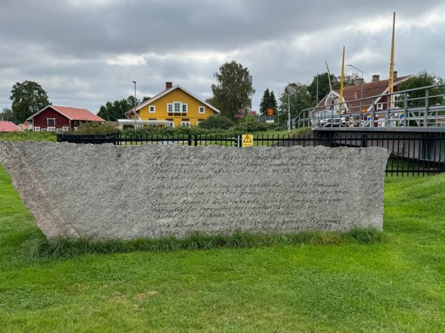 Wir finden gleich einen Parkplatz. Nur noch die entsprechende App herunterladen, installieren, registrieren und Kreditkartendaten eingeben- dann können wir uns alles ansehen. Es ist erstaunlich ruhig hier. Wir schauen uns erstmal um: Direkt an der Brücke neben der Schleuse, steht ein großer Gedenkstein, auf dem man (im Original auf Schwedisch) lesen kann: