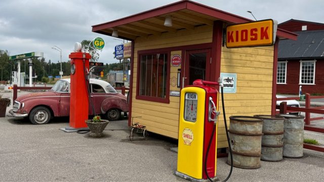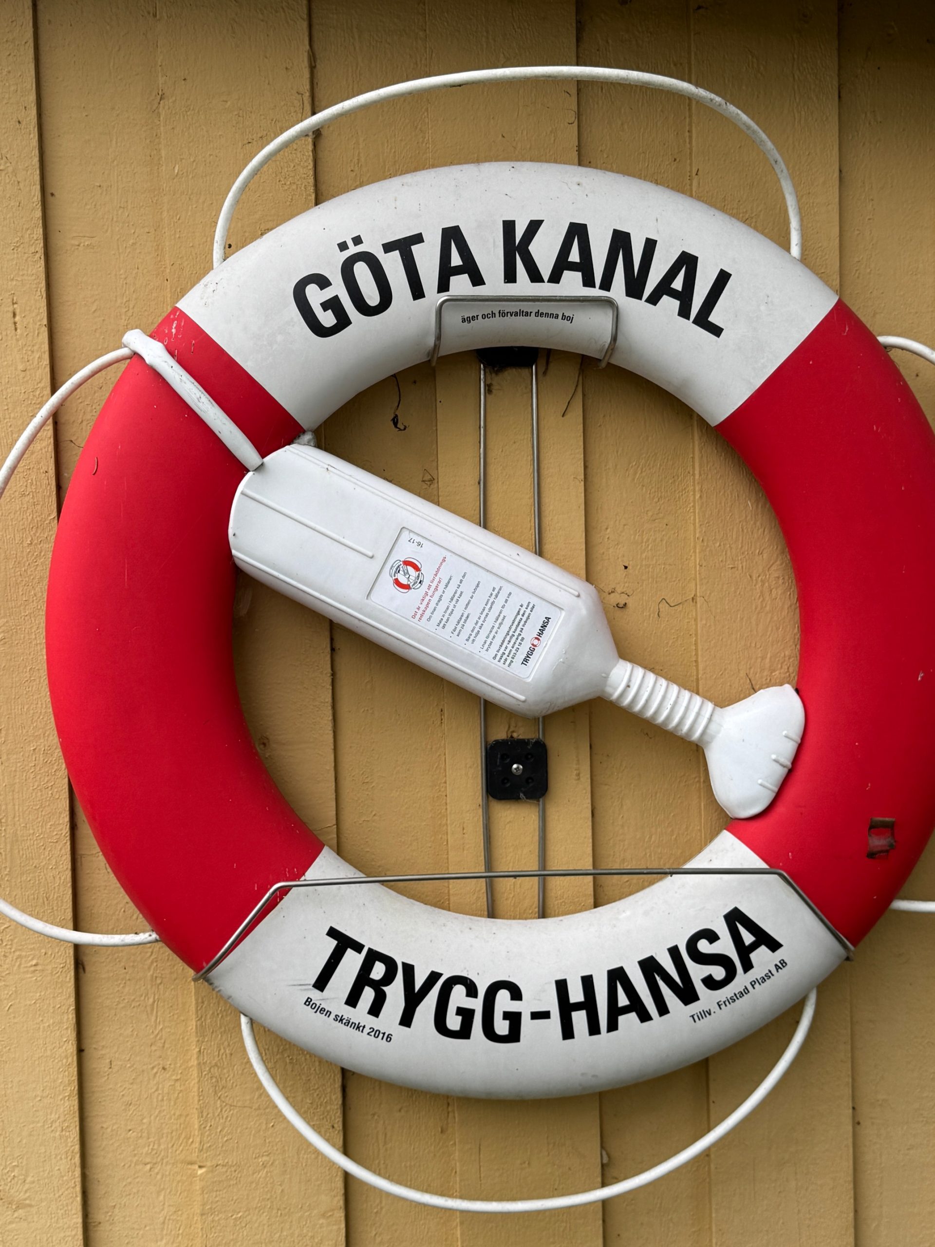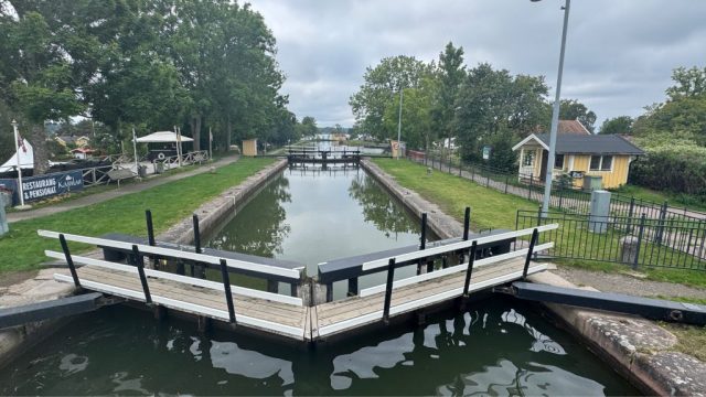 Wir lassen das Café Baltazar links liegen und spazieren Richtung See. Die Slussportens Våfelstuga (Waffelstube) hat leider geschlossen. Auch die anderen Cafés sind ausgestorben und schon winterfest gemacht. Von dem Sommeridyll und den Tausenden Besuchern, die im Sommer hier sind, ist jetzt Anfang September nicht mehr viel übrig. Die Fish ‘n’ Chips- Bude und das Tankstellenbistro haben noch geöffnet. Aber das ist nicht das, was wir uns vorgestellt haben. Also suche ich ein Café im Nachbarort raus, direkt am Göta-Kanal mit schönem Garten. Einziges Manko: Es schließt laut Google um 15:00 Uhr! Also sputen wir uns, dann haben wir noch eine Stunde Zeit – „los geht’s!“
