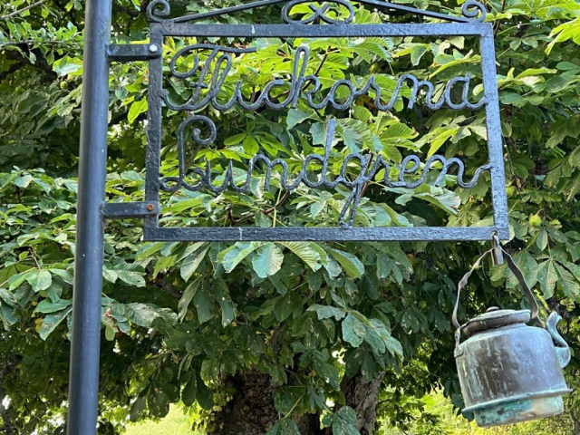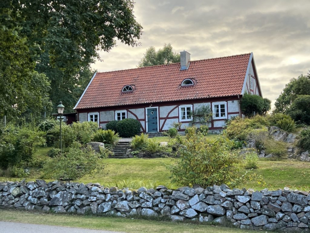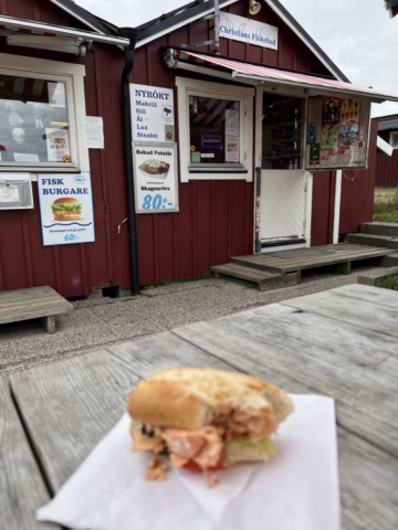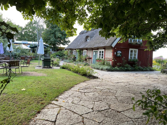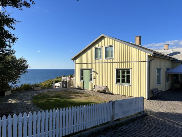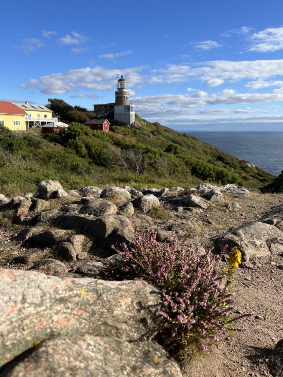 Erstes Ziel: Der Kullensfyr, der angeblich stärkste Leuchtturm Schwedens mit einer Reichweite von bis zu 50 km. Imposant steht er an der steil abfallenden Felsküste. Wir erkunden die Gegend um noch ein paar Kalorien für das nächste Highlight der Gegend zu sammeln. Das Café Flickorna på Skäret. Hier soll es in wunderschöner Atmosphäre hausgemachte, leckere Kanelbullar und Kuchen geben. Aber irgendjemand denkt an unser Hüftgold, denn das Café ist in der Nebensaison nur noch am Wochenende geöffnet. So können wir es leider nur von außen bewundern: Ein Reet-gedecktes Fachwerkhaus mit wunderschönem Garten und Aussensitzen. Das wäre der perfekte Abschluss für den Tag gewesen, aber jetzt müssen wir uns etwas anderes suchen.
