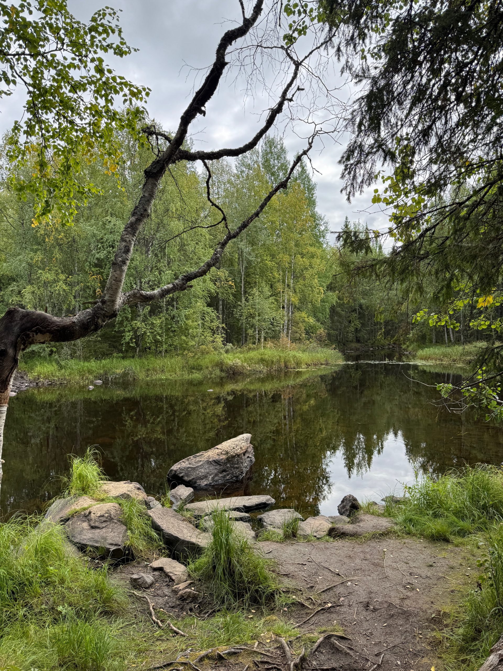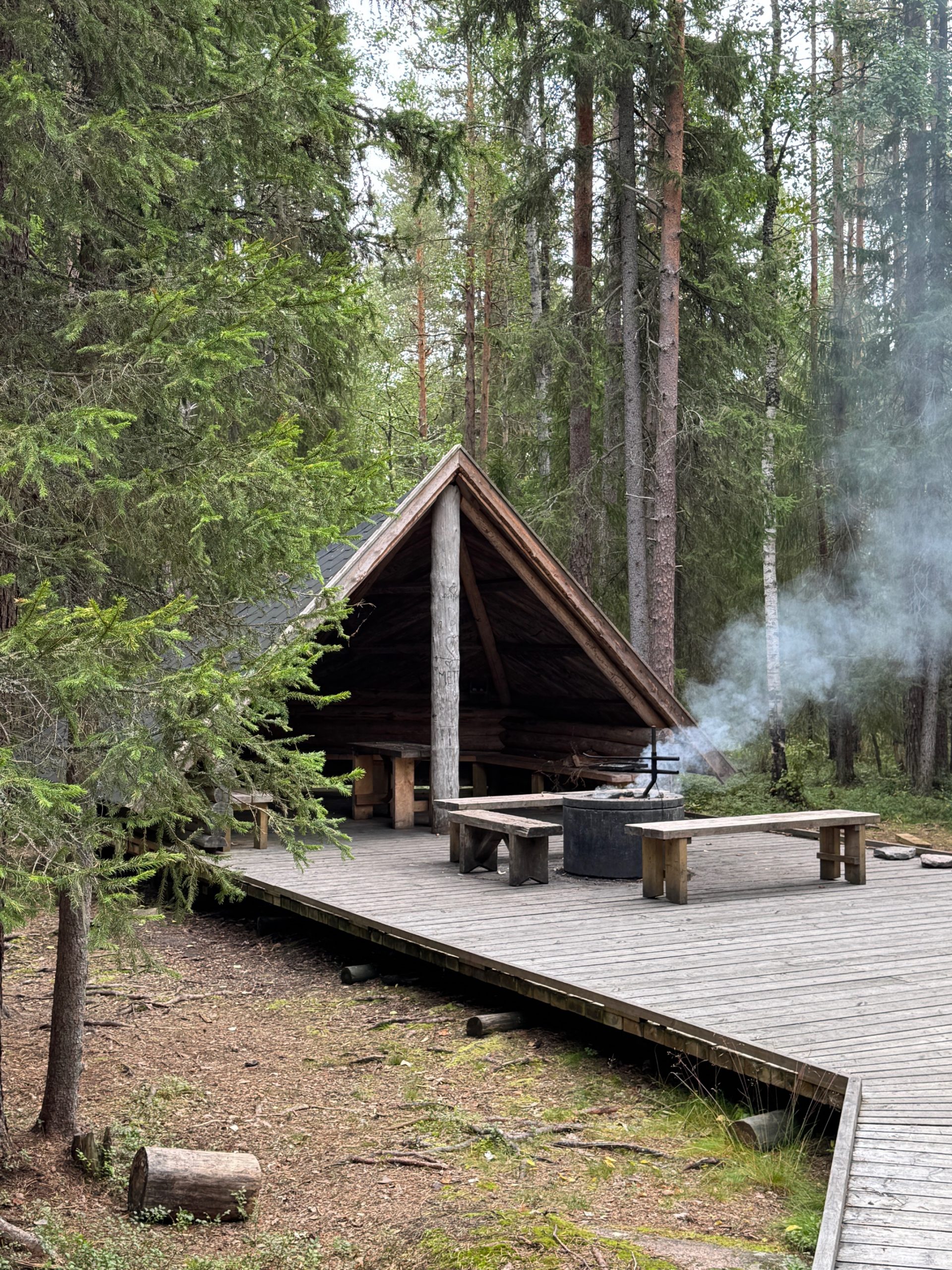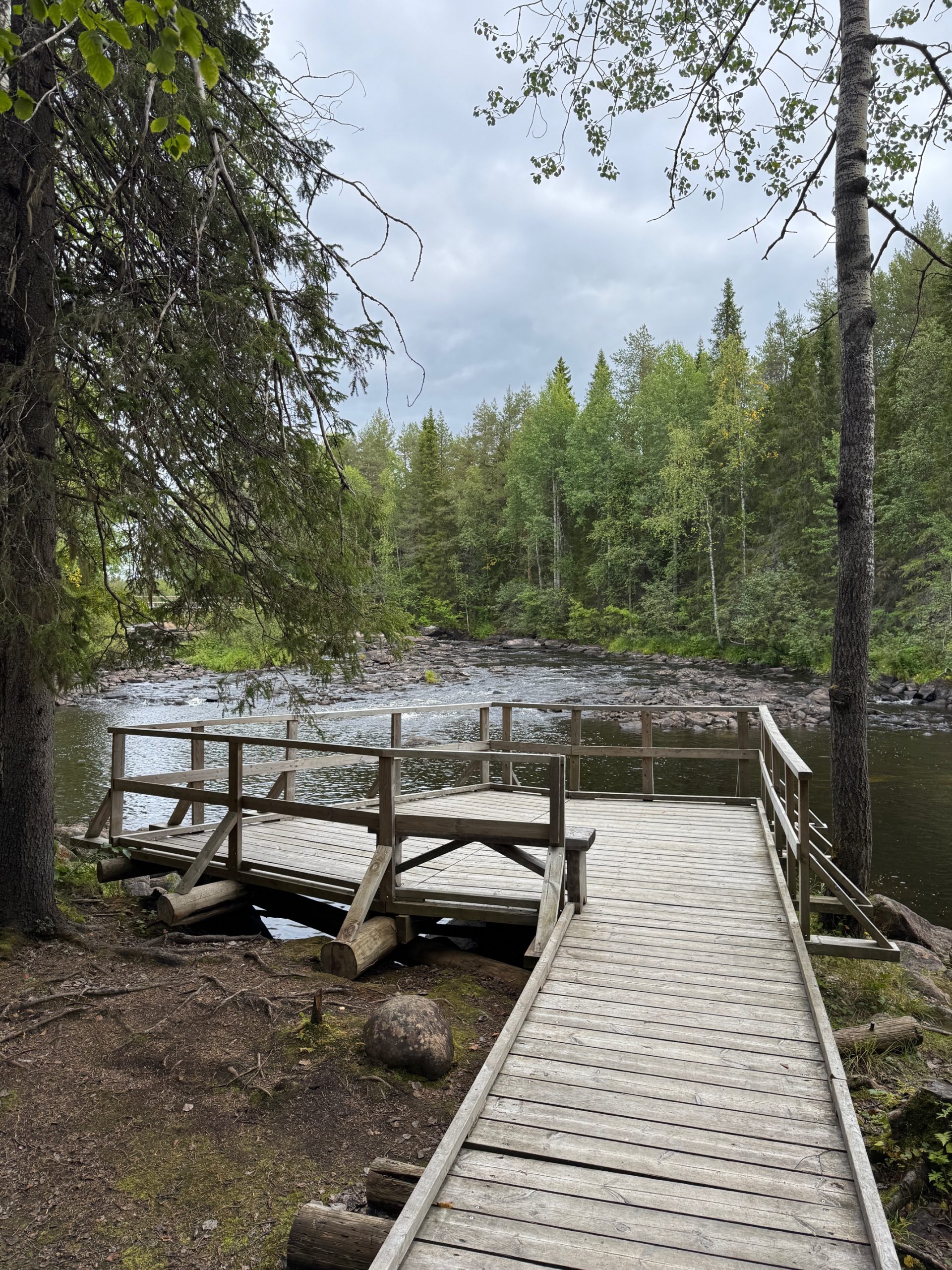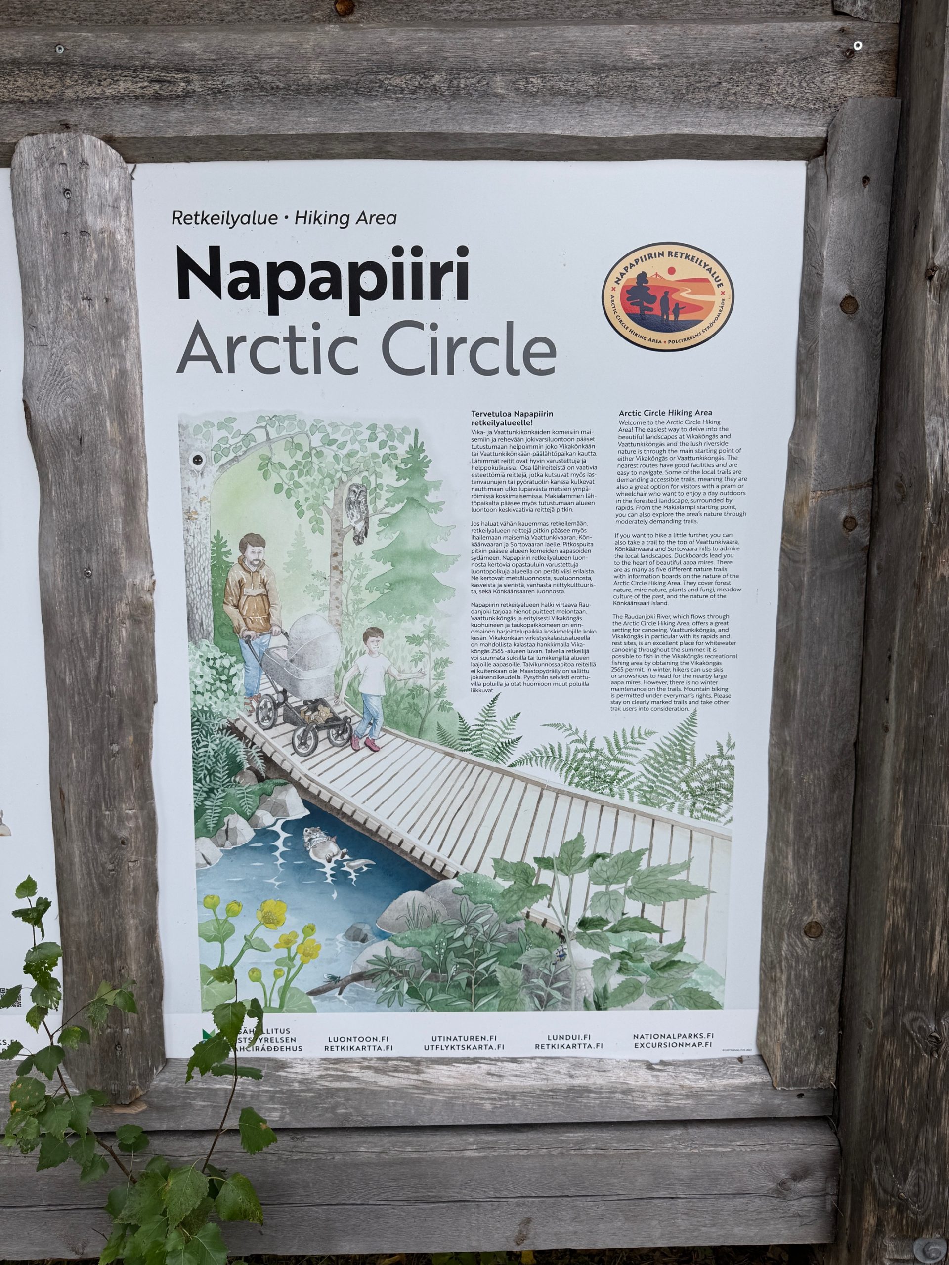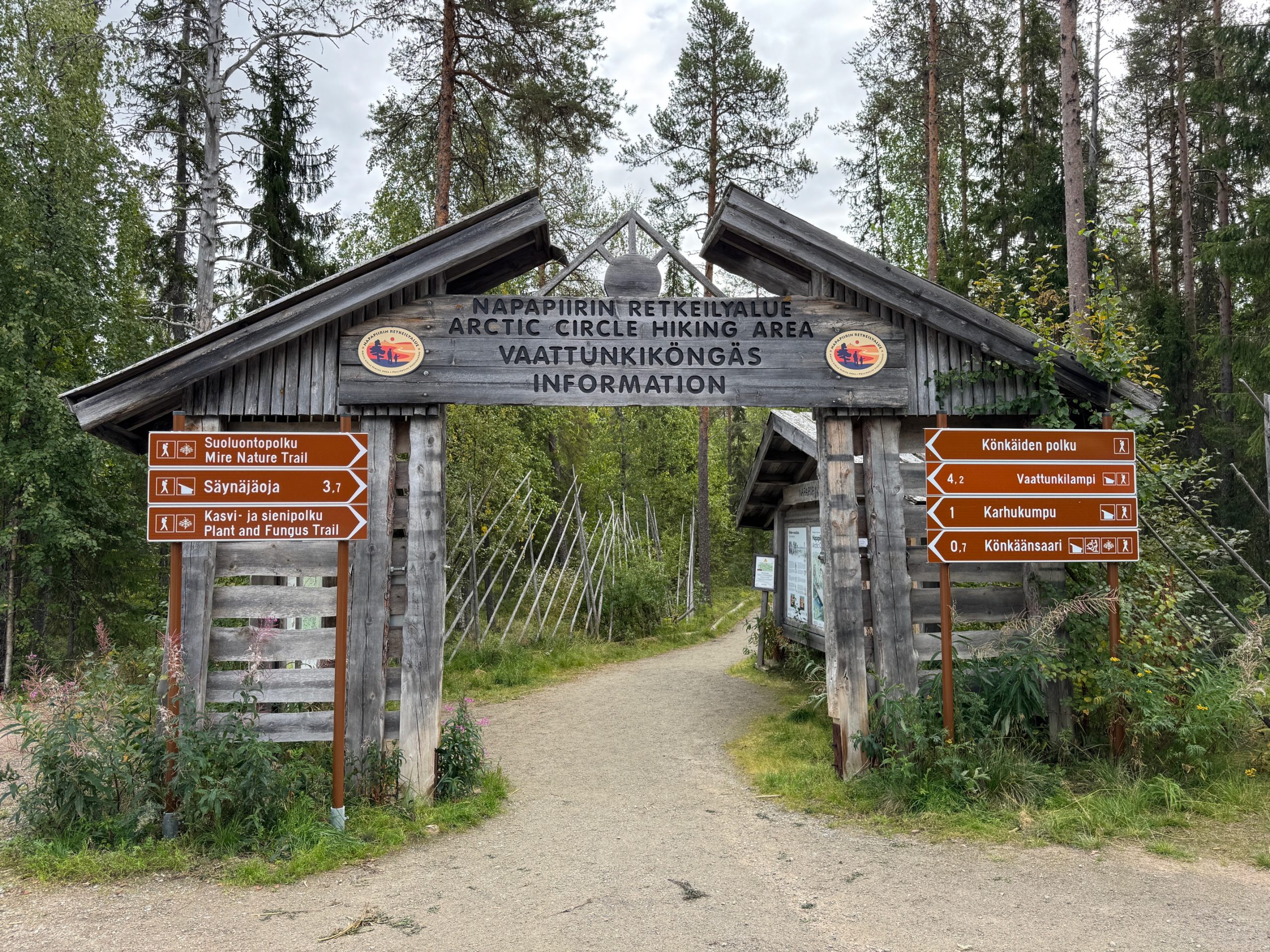 Langsam füllt sich der Wanderparkplatz mit Finnen. Wir stehen am Ausgangspunkt des „Vaattunkiköngäs“ im Arctic Circle Wandergebiet. Hier gibt es zwischen Kiefernwäldern und Mooren, die Stromschnellen des Raudanjoki, Hängebrücken und schöne Aussichtspunkte. Die Wanderungen gehen von „leicht“ bis „schwer“ und sind sogar kinderwagen- und rollstuhlgerecht. Wir wollen heute noch ein gutes Stück fahren und drehen daher nur die kleine Runde. Ein wirklich liebevoll gestalteter Rundweg erwartet uns. Auf Holzbohlen geht es durch den Wald, vorbei an Aussichtspunkten, toll gestalteten Infotafeln und mit Grill- und Picknickplätzen!