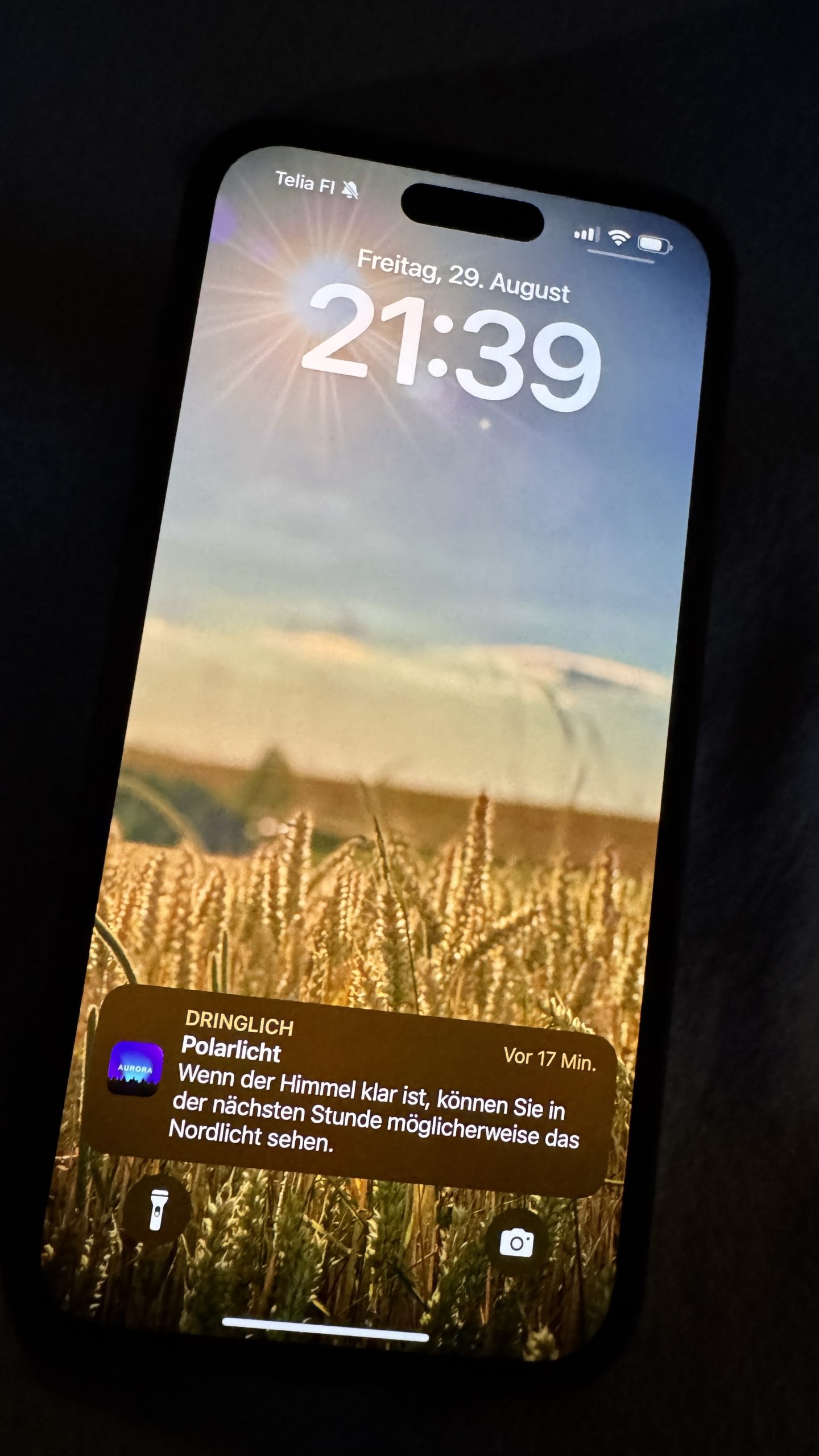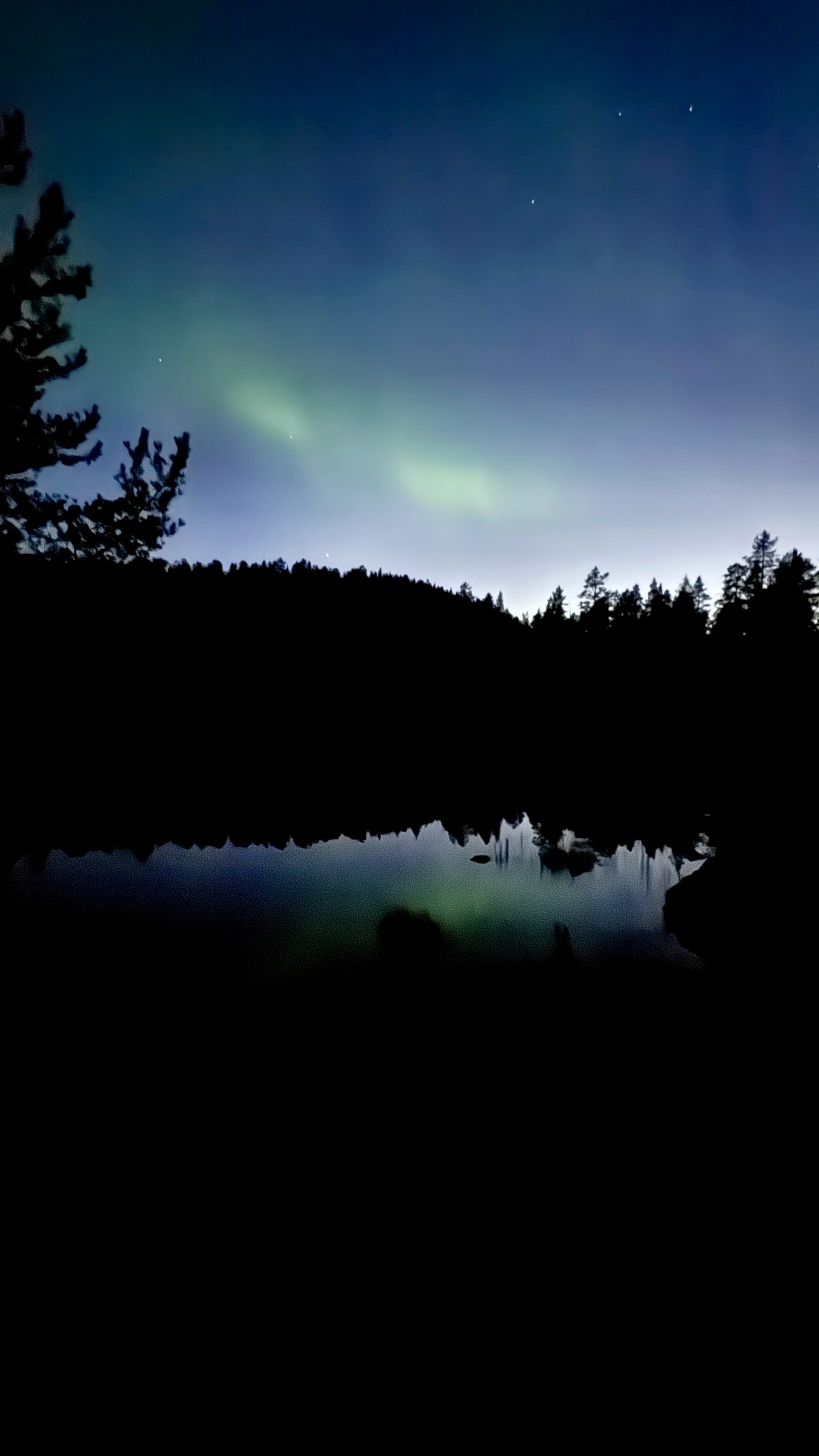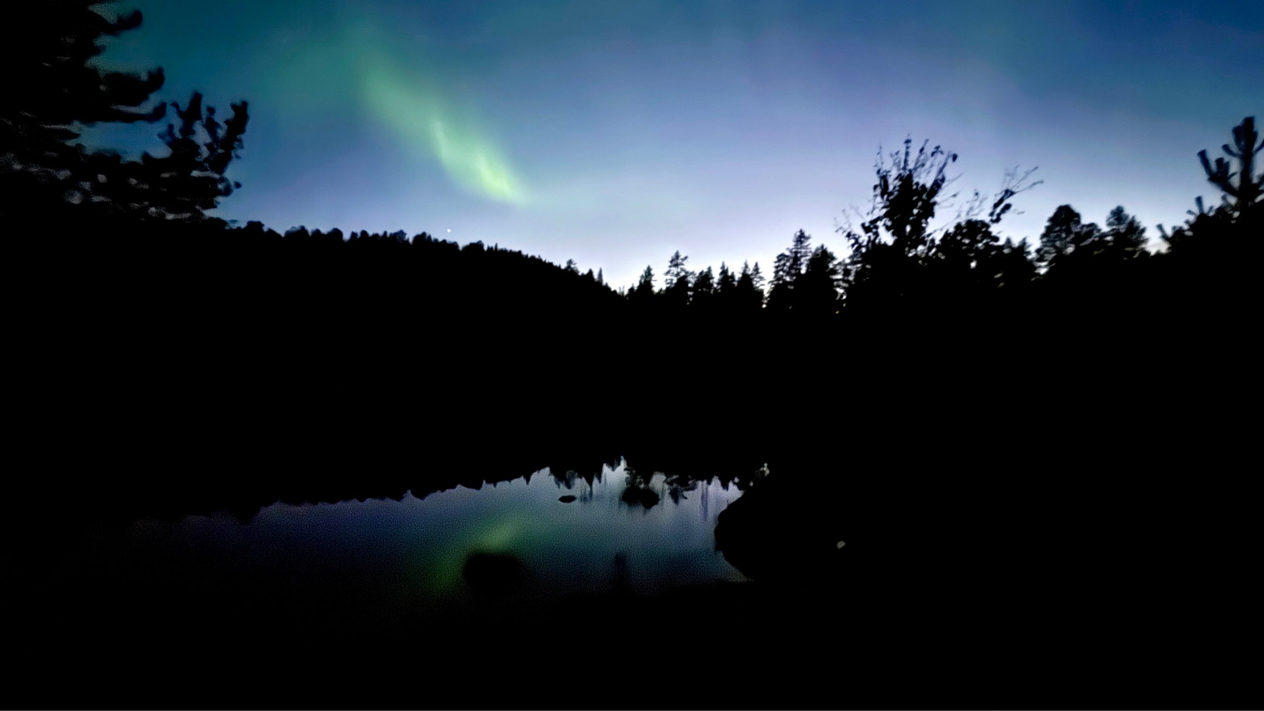 Nach dem Essen vibriert mein Handy. Die Aurora-Warnapp meldet sich! Ich wundere mich, habe ich doch beim Essen beiläufig erwähnt, dass es heute sternenklar wird und vielleicht Chancen auf Polarlichter bestehen! Ein dummer Zufall oder ein Zeichen?! Wir stehen eigentlich am perfekten Ort: Kein Umgebungslicht und Blick nach Norden. Aber der kp- Wert liegt nur bei 0,67 und sich deshalb die Nacht um die Ohren schlagen? Die Antwort lautet: JA! Ich lungere vor dem Fenster, wie ein kleines Kind, das dem Weihnachtsmann auflauert. Checke regelmäßig die Chancen in der App und frage mich frustriert, warum Andere in unserer Nähe Sichtungen melden. Da tut sich rein gar nichts. Rausgehen möchte ich auch nicht, denn es ist ziemlich frostig. Während Marco sich im Bad bettfertig macht, verkrieche ich mich ins Bett und schaue durch das hintere Fenster ins Dunkle. Ich gebe der Sache noch eine Chance und plötzlich springe ich hektisch aus dem Bett: Da tanzen tatsächlich, hell-grün leuchtend und mit bloßem Auge erkennbar, Polarlichter am Himmel. Schnell die Jacke übergeworfen, Marco aus dem Bad gezerrt, die Kamera geschnappt und ab in die Kälte! Wie schön ist das bitte? Die Aurora tanzt über Ragnar, spiegelt sich in dem kleinen See und ich zittere vor Aufregung (und Kälte) so sehr, dass meine Bilder unscharf werden. Zum Glück ist der Polarlicht-Skeptiker neben mir weniger emotional und so könnt ihr auch in den Genuss der Aufnahmen kommen.