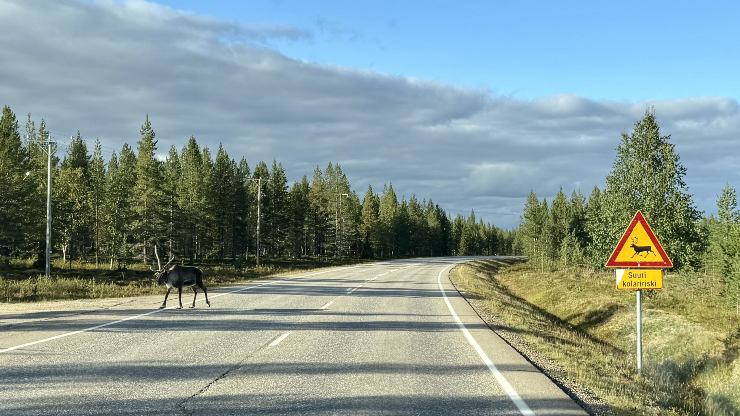 Zufrieden setzen wir unsere Fahrt Richtung Inari fort. Kurz hinter Rovaniemi macht Marco auf freier Strecke eine Vollbremsung. Zuerst dachte er, es handelt sich um einen Radfahrer. Falsch gedacht: es ist ein junges Rentier, das uns am Wegesrand entgegenläuft. Ich kann gerade noch das Handy zücken und ein unscharfes Foto von seinem Hinterteil machen. Wildtiersichtungen +1, nein +2, +3, +4 … überall laufen oder grasen Rentiere. Wir freuen uns wie kleine Kinder über diese tollpatschigen Gesellen und der Elch-Frust ist fast verflogen.