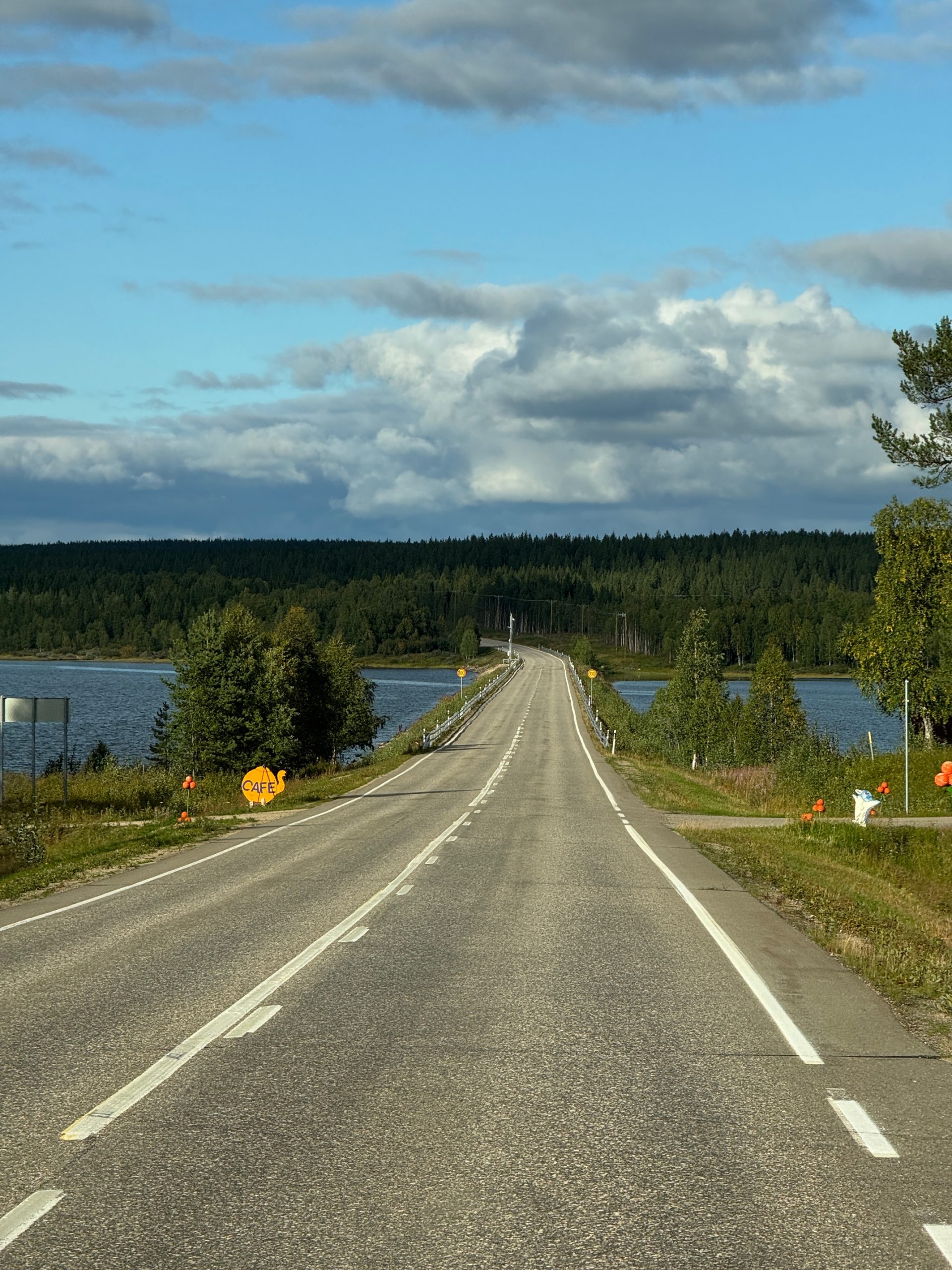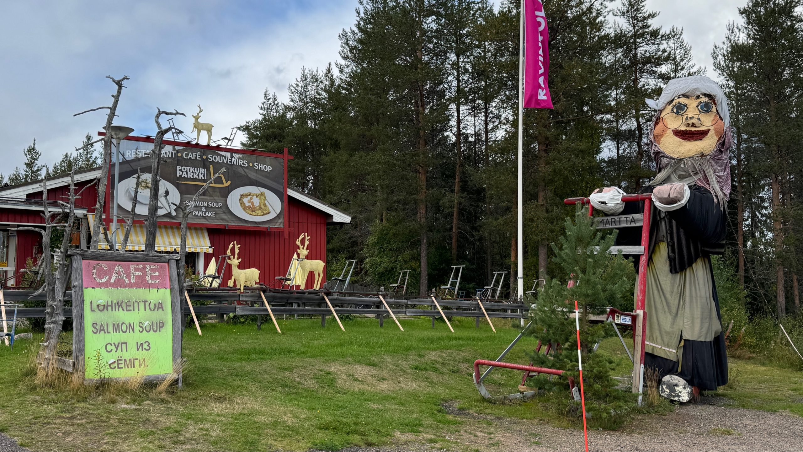 Gegen 14:00 Uhr verspüren wir ein kleines Hüngerchen und Kaffeedurst. Im Potkuriparkki, einer Mischung aus Café und Souvenierladen, halten wir an. Auch hier kommen uns drei Rentiere mit beeindruckendem Geweih entgegen, lassen sich aber nicht ablenken und traben auf die E4. Im Lokal sitzen ein paar Einheimische und genießen ihre Suppe. Ich kann nicht anders und bestelle mir eine „Lohikeittoa“, eine traditionell, finnische Lachssuppe mit Karotten, Kartoffeln und Lauch. Marco ist skeptisch und bleibt beim Schinkenbrötchen und Kaffee. Nachdem ich ihn aber überreden kann, probiert er doch und wärmt sich an der leckeren Suppe. Zum Nachtisch gibt es dann noch einen Pfannkuchen mit selbstgemachtem Moltebeeren-Gelee. Ich würde sagen: Der kleine Exkurs in die Finnische Küche ist gelungen. Rentier möchte ich dennoch nicht unbedingt probieren.