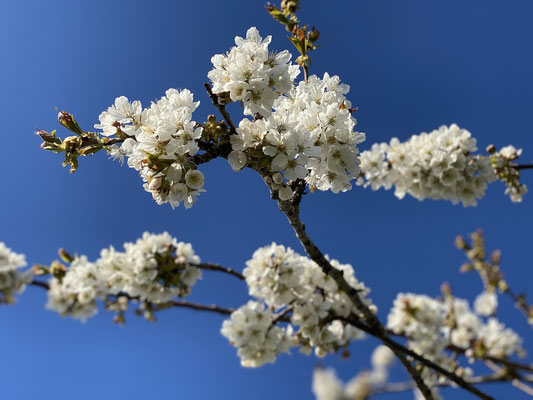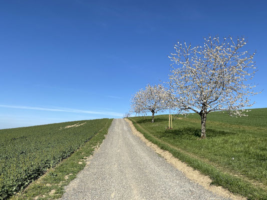 Ein lohnenswerter Spaziergang, vorbei an blühenden Obstbäumen und Feldern, der mit einer wunderschönen Aussicht belohnt wird.