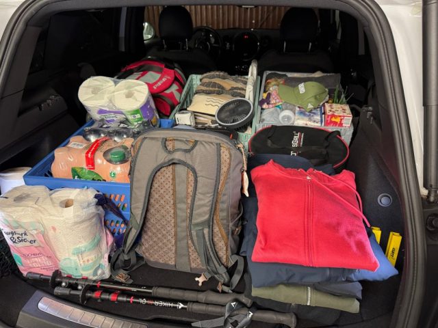 - Klamotten und alles was man für einen Roadtrip so braucht sind in Kisten sortiert, um später effizient einräumen zu können