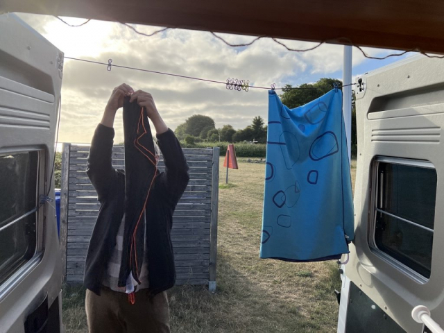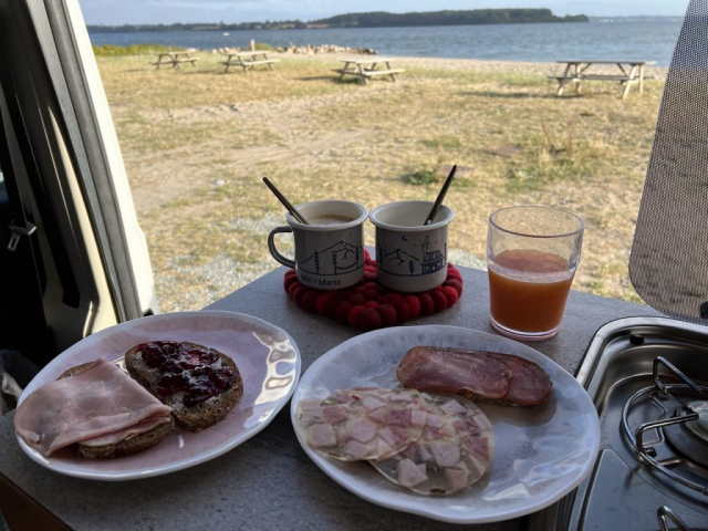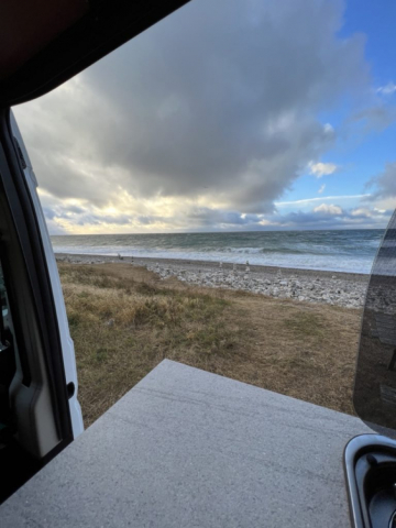 Nach der Morgenroutine (und damit ist endlich mal kein Videomeeting gemeint) und einem gemütlichen Frühstück, retten wir noch ein junges Mädel vor einsetzendem Koffeiinentzug! Sie hat sich gestern Nacht noch mit ihrem Camping SUV zu uns gesellt und hat Angst etwas falsch zu machen. Schließlich ist Camping verboten, aber die Definition ist auch sehr weit gefasst. Ist ein Gaskocher auf einer Picknickbank schon Camping oder zählt das zum Picknicken. Während wir ihren antiken Wasserkessel in der Kombüse zum Brodeln bringen, philosophieren wir über Vanlife und sie beneidet uns schon ein wenig für unseren „Luxus“. So ein SUV ist doch nicht das richtige Campingmobil.