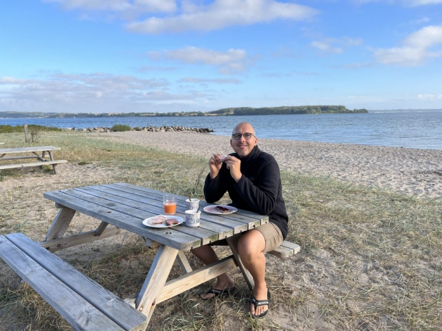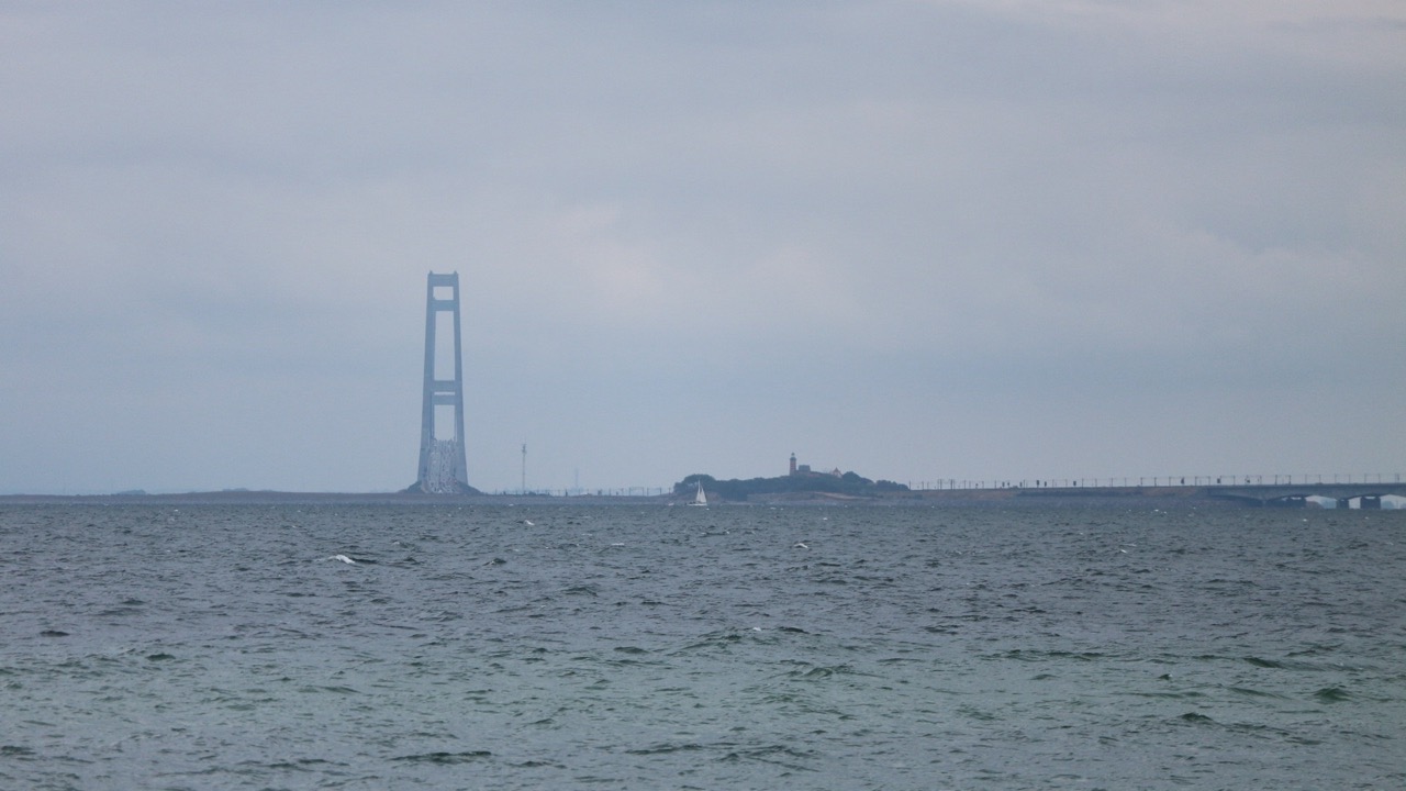 Es ist Kaffee- und Pausenzeit: Wir suchen uns ein Pausenplätzchen mit Blick auf die Storebæltbrücke über die gerade ein Regenguss nach dem anderen zieht. So wollten wir sie eigentlich nicht für unser Fotoalbum festhalten, also gedulden wir uns und trinken unseren Kaffee mit Blick auf das Meer, die Regenwolken und die juchzenden Dänen, die sich im Meer vergnügen. Am heutigen Sonntag scheint in Dänemark Badetag zu sein, denn trotz des vermutlich kalten Wassers wagen viele den Schritt ins kalte nass.
