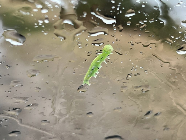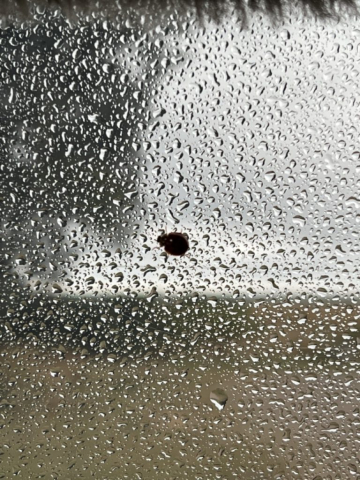 Es fängt auch an unserem Aussichtspunkt an zu regnen. Ach nee, das war kein Wasser von oben, sondern die Möwe, die sich gerächt hat, weil wir unseren Kuchen nicht mit ihr teilen wollten! Bevor der richtige Regenguss uns dann doch einholt, flüchten wir in Pössi. Wir warten noch geduldig, bis die Wolken vorbeiziehen und beobachten dabei eine tapfere Raupe, die sich unsere Windschutzscheibe hochkämpft- das nennt sich dann wohl Camperkino!