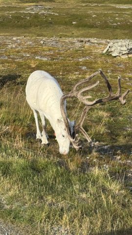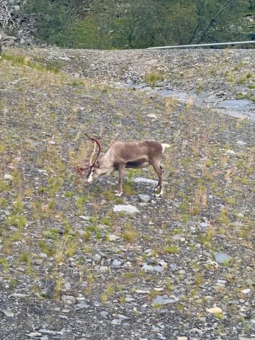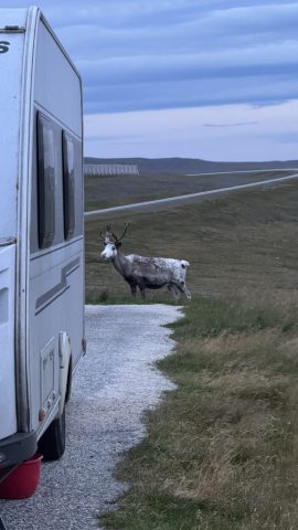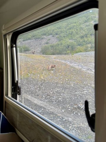 Es trappelt vor Ragnar. Wer läuft denn bitte um unseren Van? Ich öffne die Rollos und staune nicht schlecht, da grasen tatsächlich Rentiere. Das ist mal eine schöne Frühstücksüberraschung. Bevor wir die letzten 100 Kilometer in Angriff nehmen, beobachten wir noch den Trubel auf dem Platz und erfüllen unsere Camperpflichten.