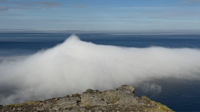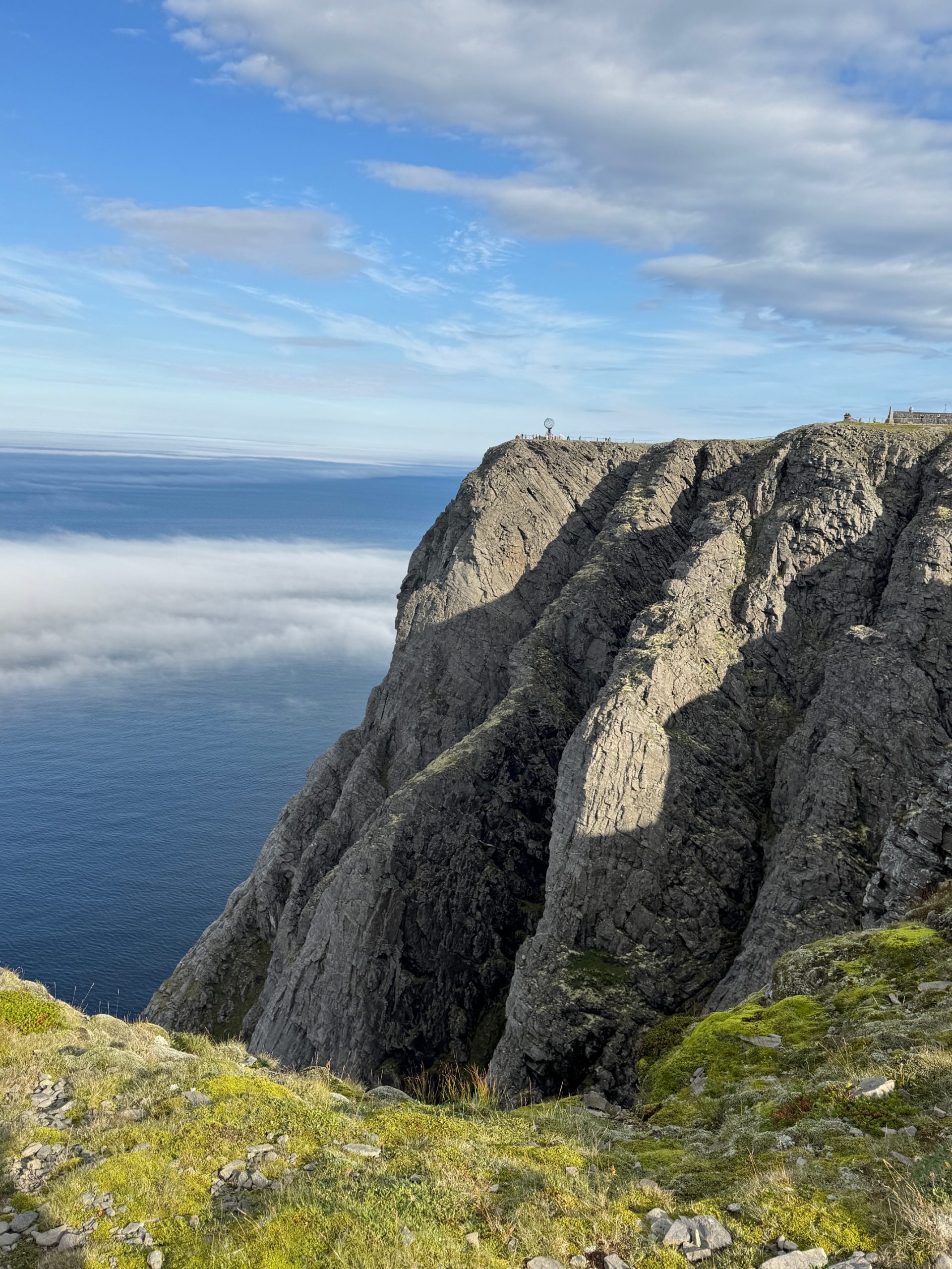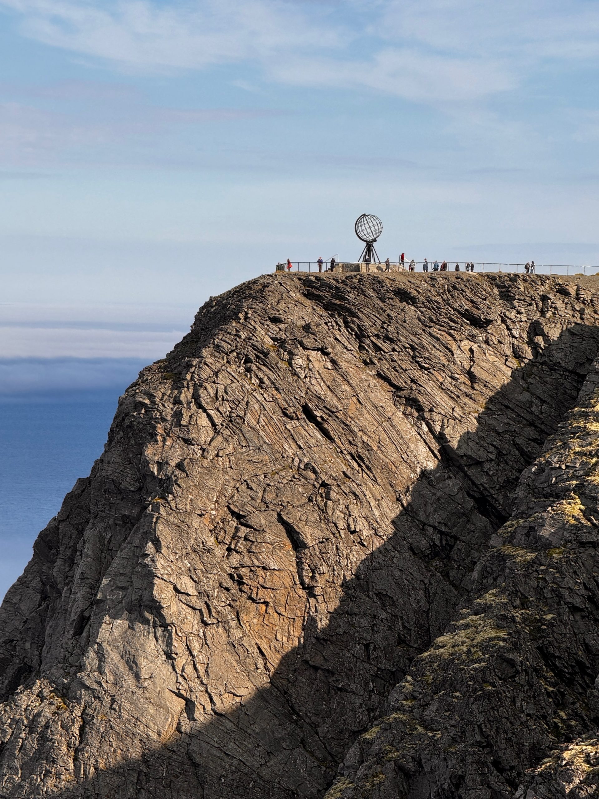Und dann lichtet sich der Nebel und das Nordkapp liegt vor uns: 71° 10′ N, 25° 47′ O. Also zuerst mal der Parkplatz, für den wir 180 NOK berappen durften. Immerhin, 5 Stunden dürfen wir dafür hier stehen bleiben. Gerne hätten wir Ragnar so geparkt, dass im Hintergrund der berühmte Globus sichtbar ist, aber es ist gerade viel los. Die Busse der Kreuzfahrtschiffe haben ihre Gäste abgeladen und es sind auch einige Camper da. Also parken wir etwas weiter weg und genießen erstmal den Blick auf die umliegenden Felsen, den Nebel, der sich unten auf dem Meer niedergelassen hat und freuen uns einfach hier zu sein.