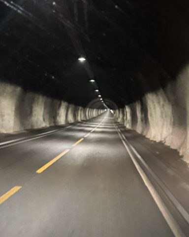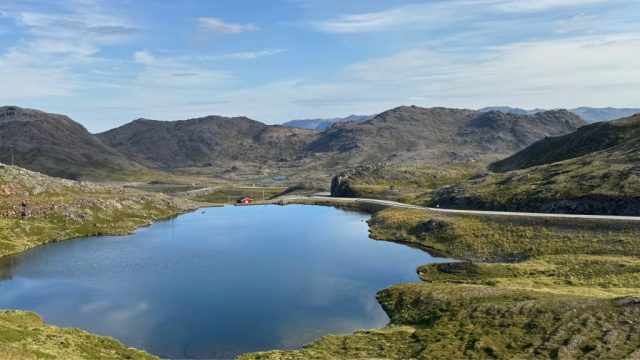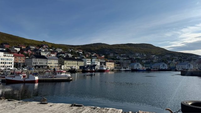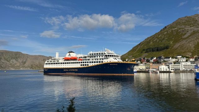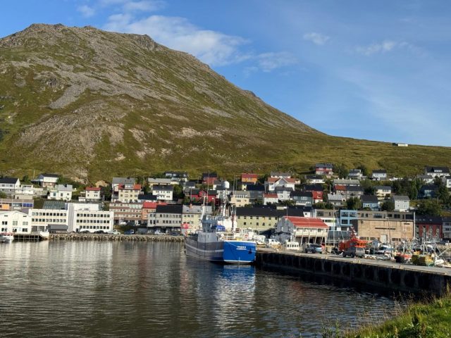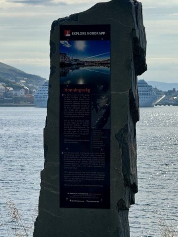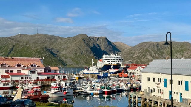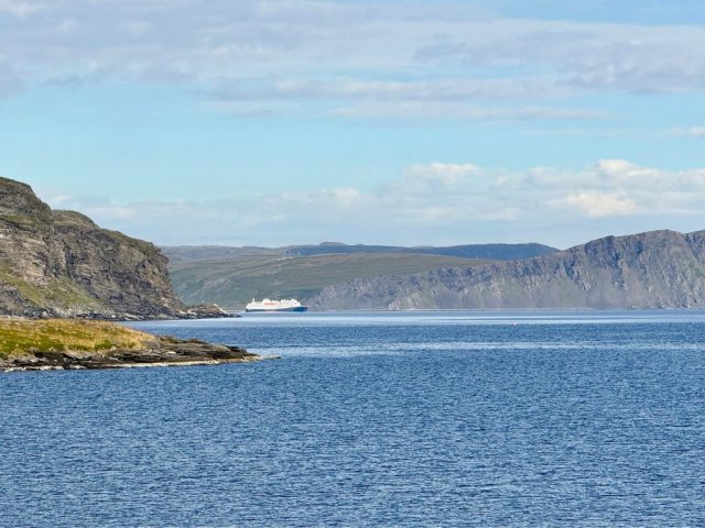 Der Wetterbericht hat nicht zuviel versprochen, die Sonne lacht mal wieder vom Himmel und wir fahren Richtung Honningsvåg. Erstmal geht es aber durch den 6,8 km langen Nordkapptunnel. Es geht steil bergab und bis zu 212 Meter unter den Meeresspiegel. Als wir in den Tunnel einfahren, sehen wir ein Postschiff im Fjord. Ob es auch nach Honningsvåg will? Die Antwort lautet: „Ja“, denn kurz nachdem wir uns den Hafen und den kleinen Ort, der hauptsächlich von Kreuzfahrtgästen bevölkert wird, angeschaut haben, legt es an. „Irgendwann“, da sind wir uns einig, dürfen wir auch mal eine Winterkreuzfahrt mit den original Hurtigruten machen.