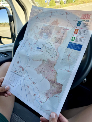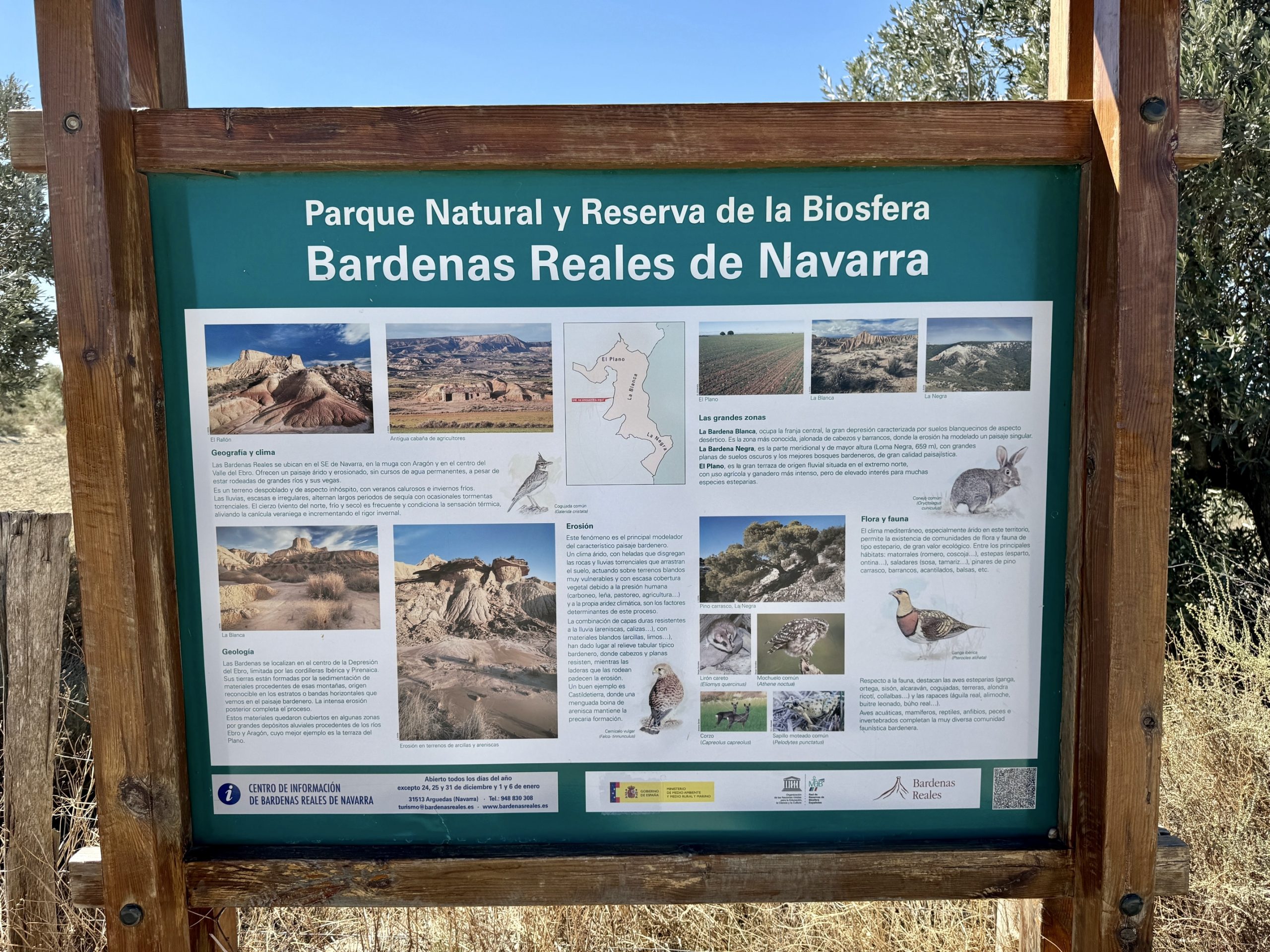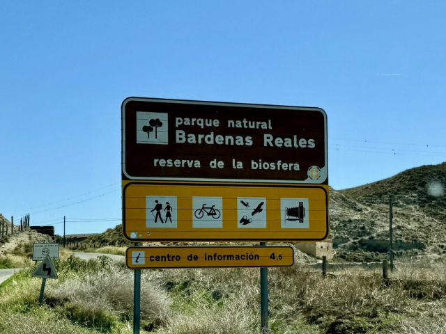 Gegen 12:00 Uhr machen wir uns auf den Weg an den Ort, weswegen wir überhaupt hier sind: in die Wüste! Genauer gesagt in Spaniens Halbwüste „Bardenas Reales“. Wir starten am Informationszentrum und ich hole erstmal eine Übersichtskarte mit Informationen zu Routen, Flora & Fauna: