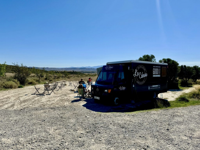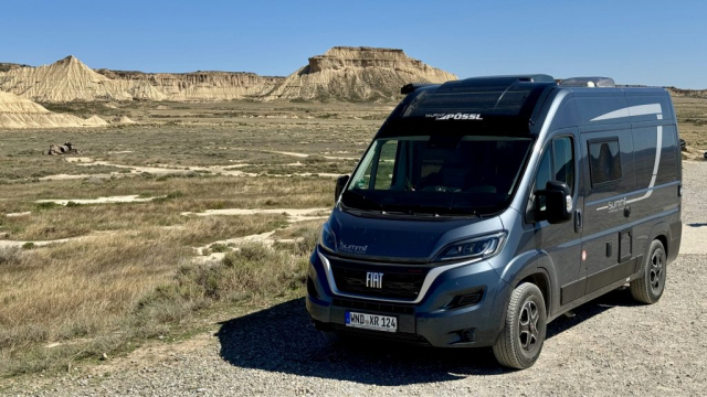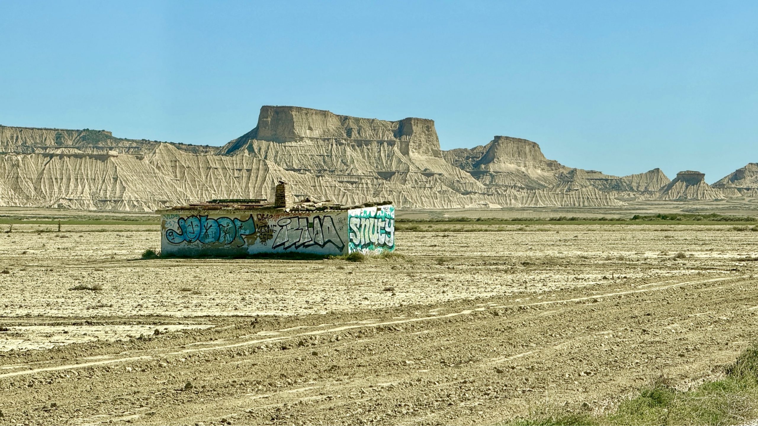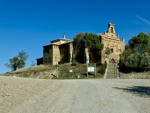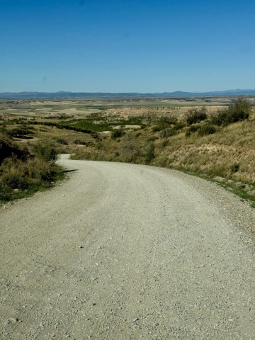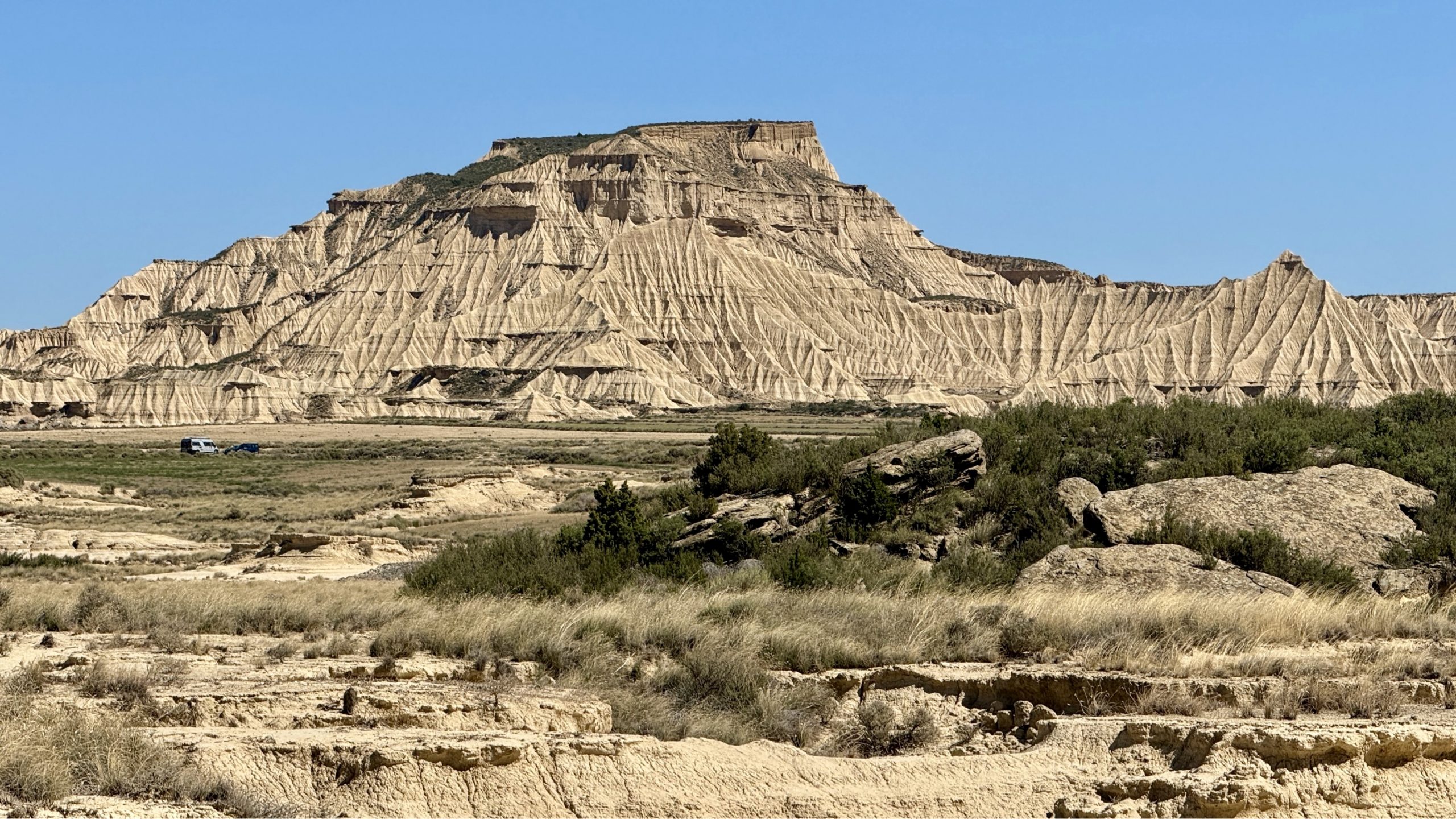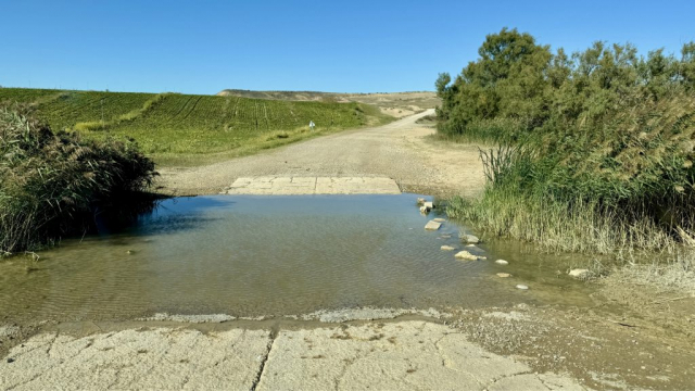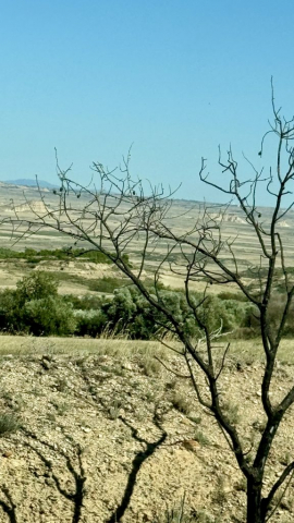Da wir noch nicht genug durchgeschüttelt sind, entscheiden wir uns, eine weitere Teilstrecke der Bardenas zu fahren und so geht es zwischen Arguedas und Valtierra rechts ab zur Ermita de la Virgen del Yugo. Uns erwartet mal wieder eine Ruckelpiste, aber auch eine noch kargere Landschaft: Denn hier haben während der Hitzewelle 2022 Waldbrände gewütet und mehrere Hektar Kiefernwälder zerstört. Am Himmel kreisen wieder die Gänsegeier und wir lotsen Pablo durch die erste Furt. Die Unterbodenwäsche hätten wir damit abgehakt. Fehlt nur noch eine Waschstraße, um den Rest des Staubs loszuwerden.