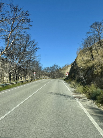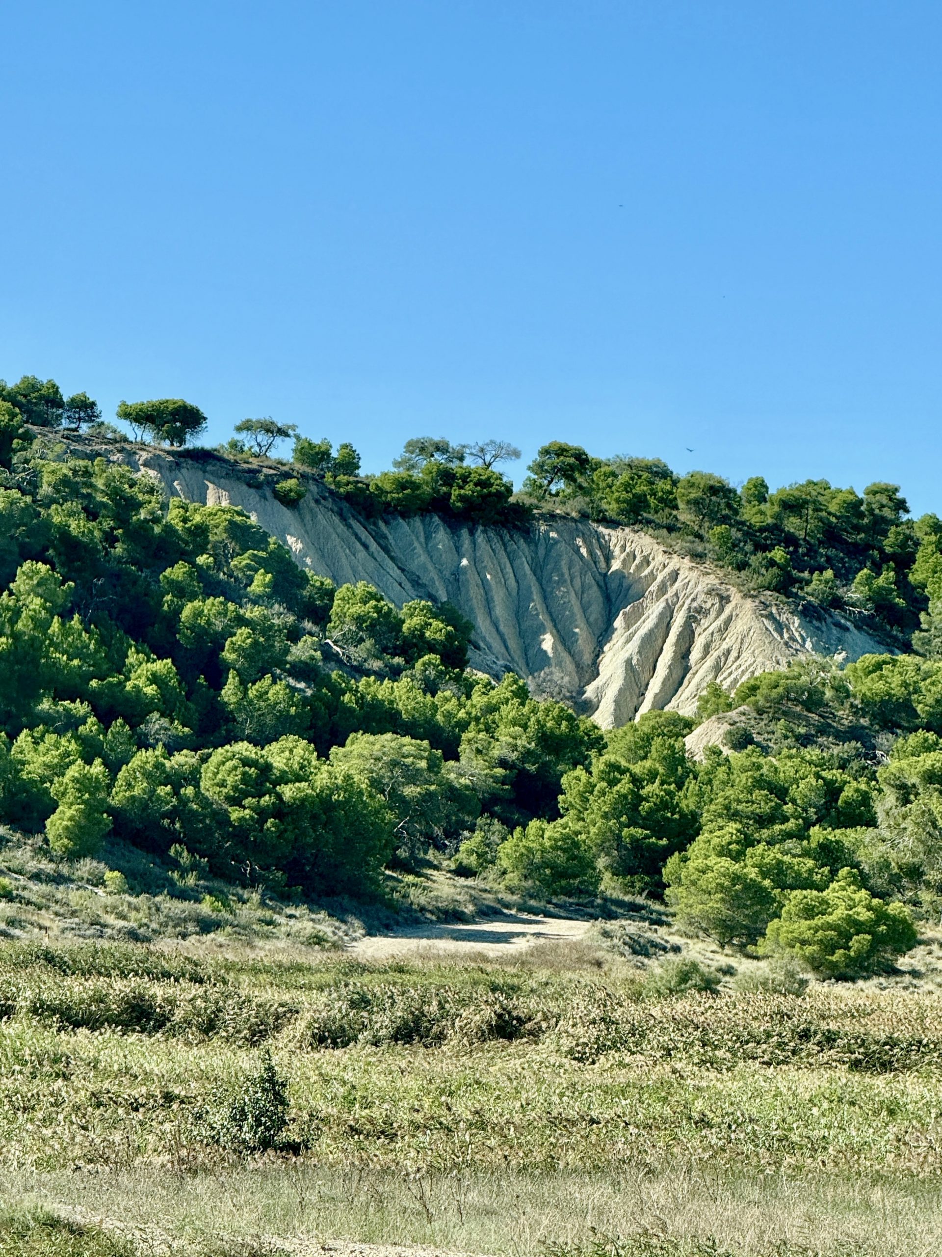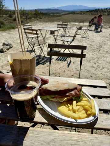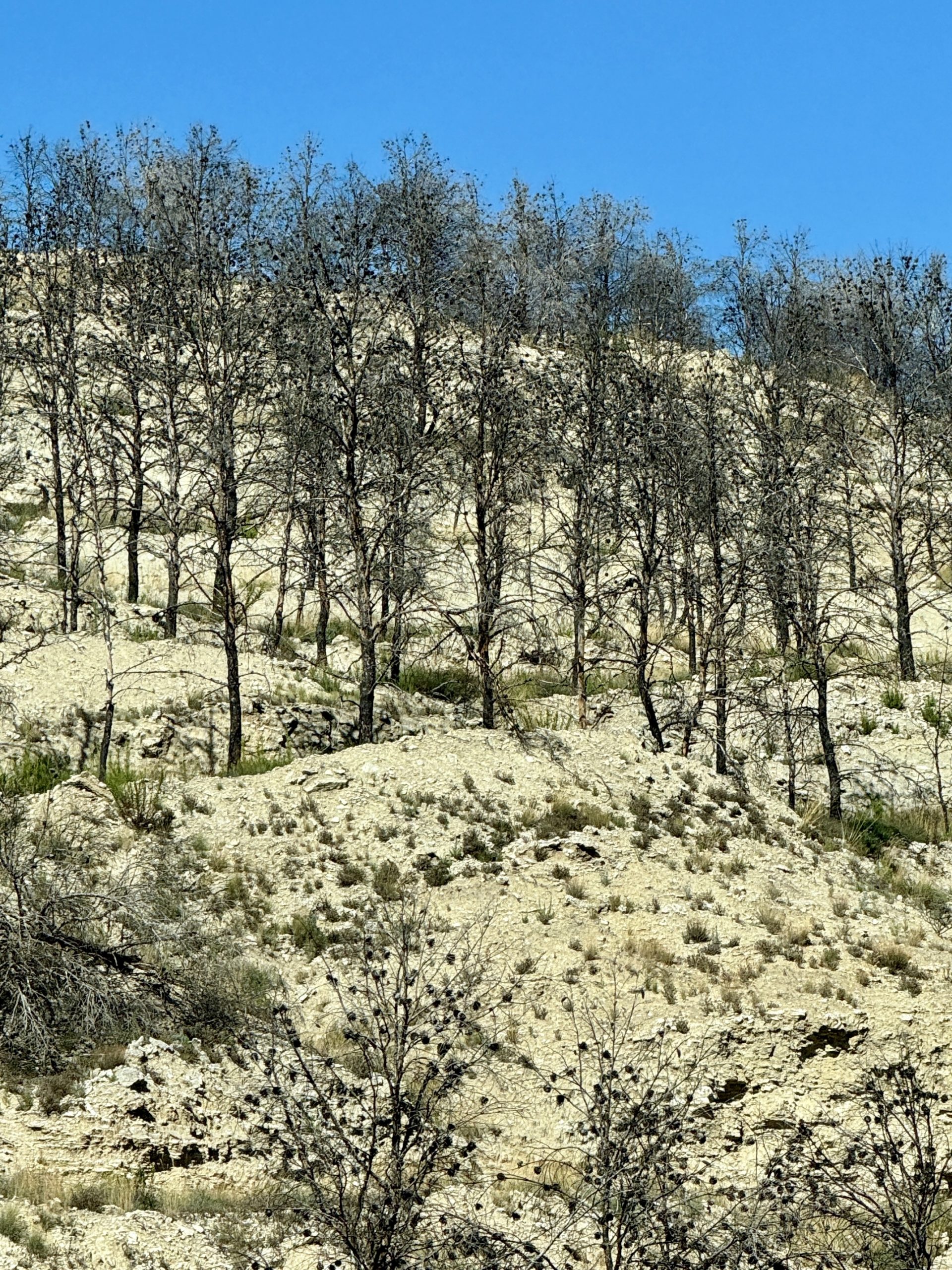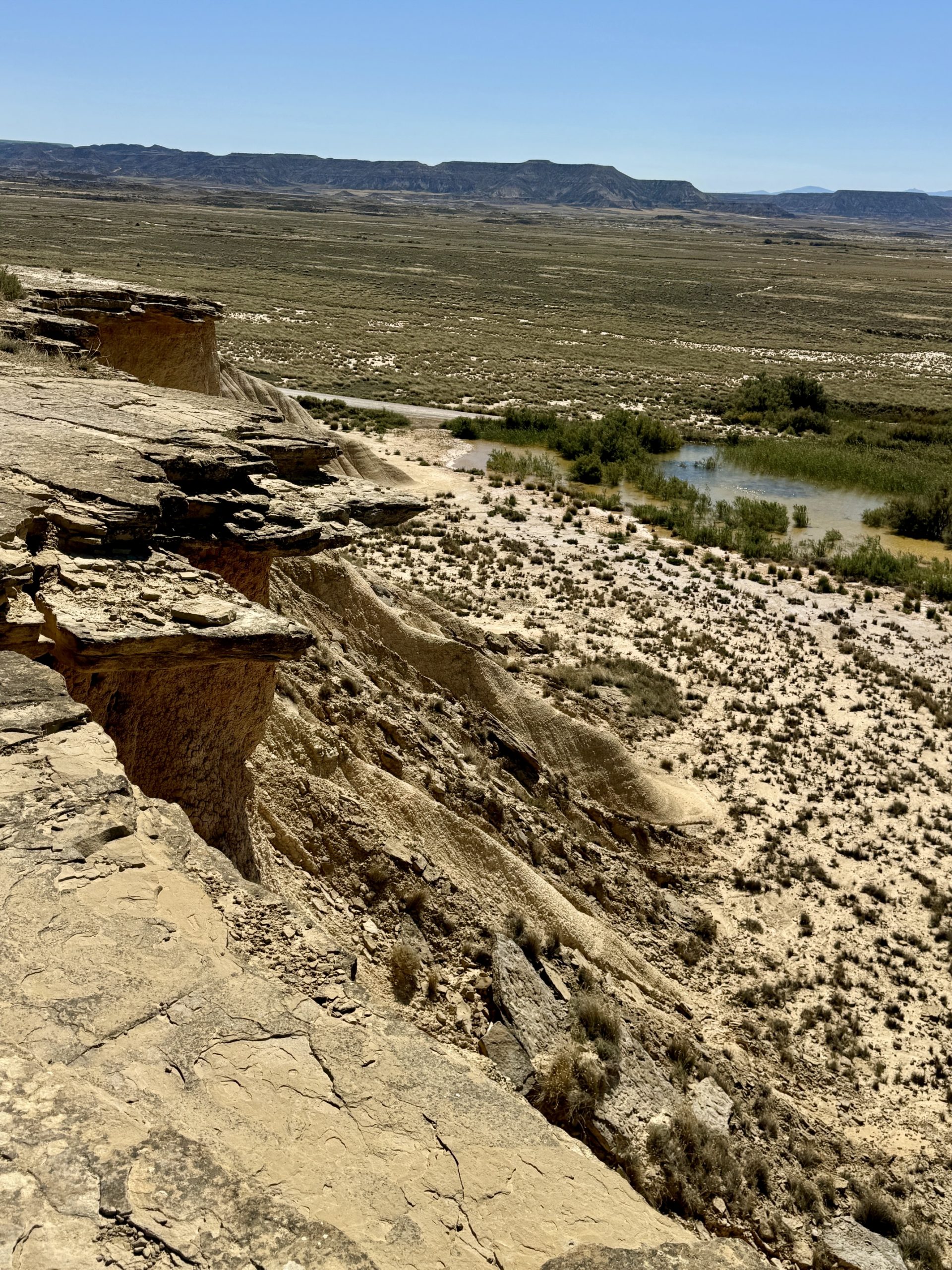 Da wir noch nicht genug durchgeschüttelt sind, entscheiden wir uns, eine weitere Teilstrecke der Bardenas zu fahren und so geht es zwischen Arguedas und Valtierra rechts ab zur Ermita de la Virgen del Yugo. Uns erwartet mal wieder eine Ruckelpiste, aber auch eine noch kargere Landschaft: Denn hier haben während der Hitzewelle 2022 Waldbrände gewütet und mehrere Hektar Kiefernwälder zerstört. Am Himmel kreisen wieder die Gänsegeier und wir lotsen Pablo durch die erste Furt. Die Unterbodenwäsche hätten wir damit abgehakt. Fehlt nur noch eine Waschstraße, um den Rest des Staubs loszuwerden.