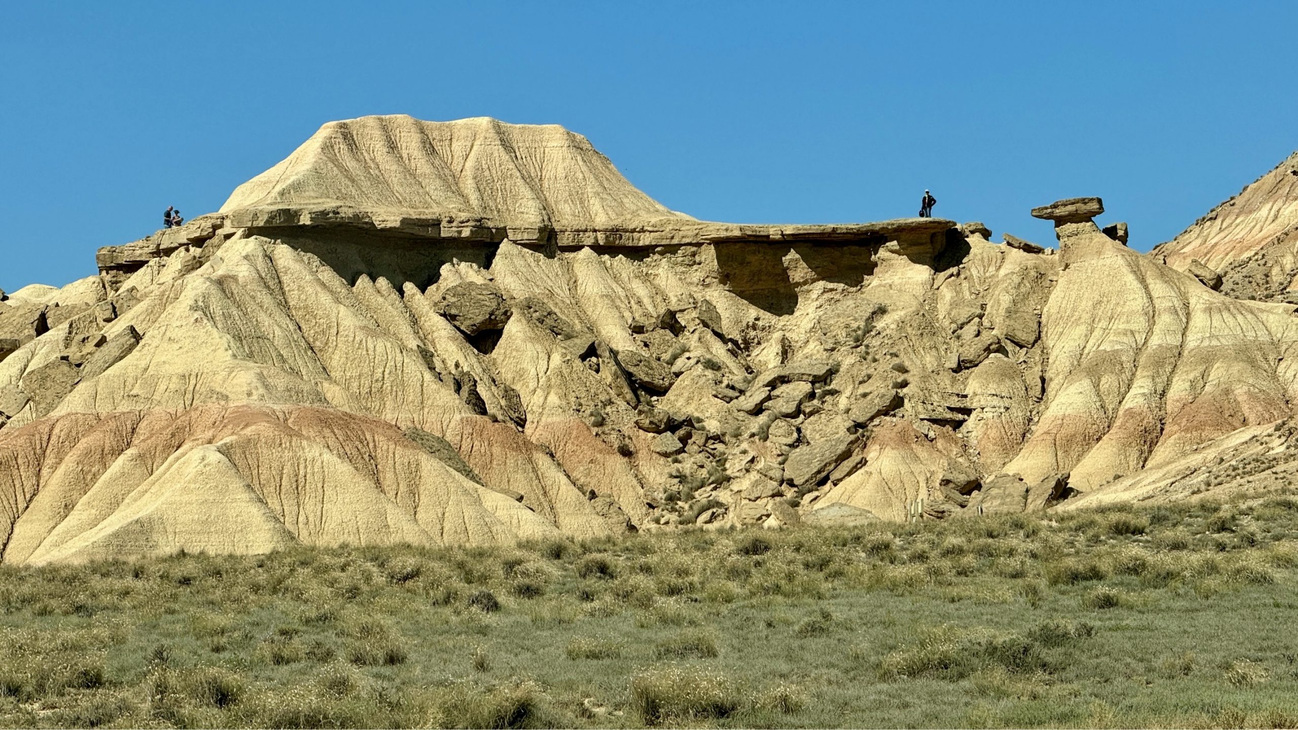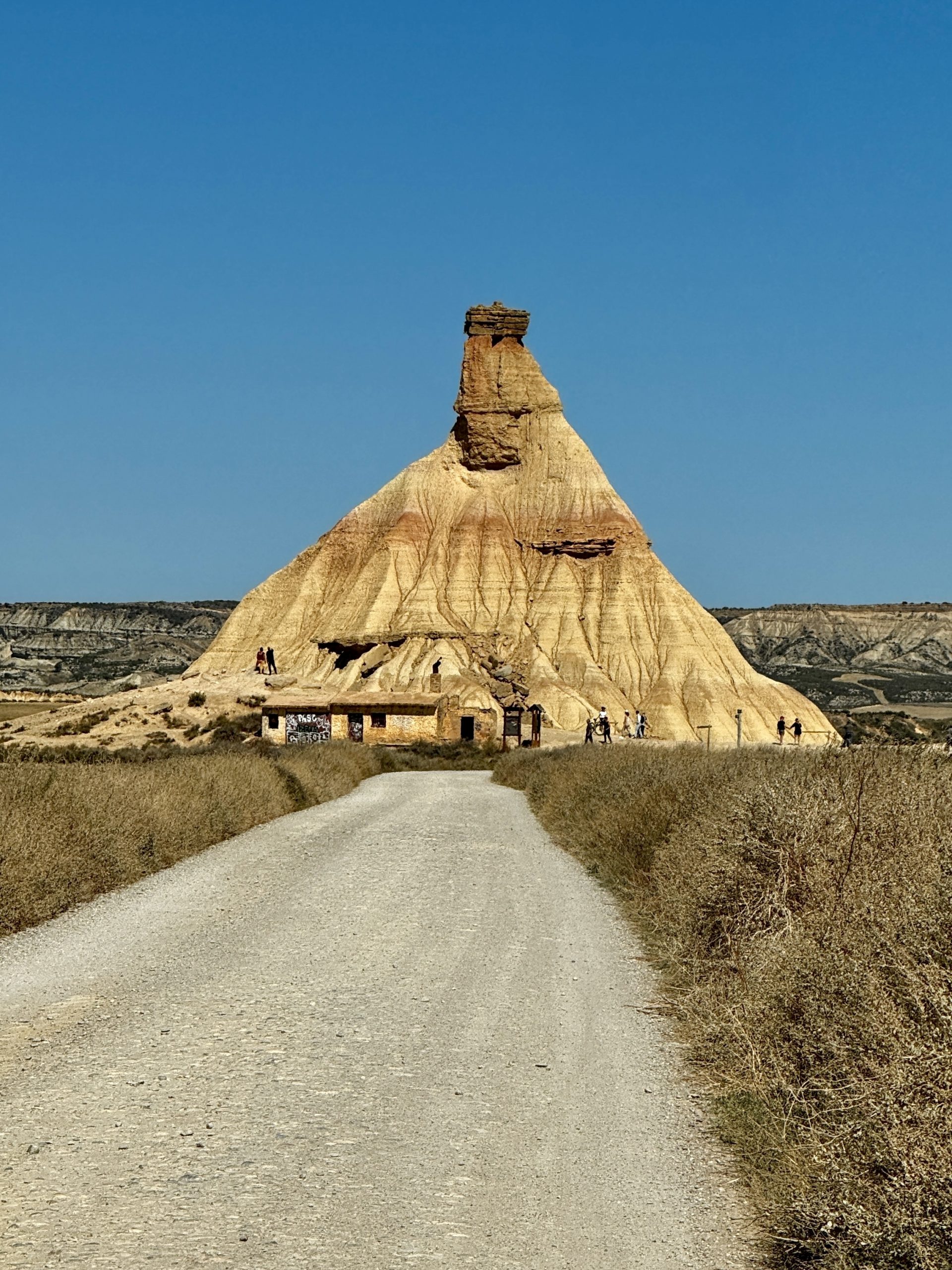 Kurz nach dem Infozentrum erreichen wir schon den ersten Aussichtspunkt: Vor uns erstreckt sich eine Landschaft, geprägt von bizarren Felsen, kargen Feldern, tiefen Schluchten und weiten Ebenen. Man hat das Gefühl mitten im „Wilden Westen“ der USA gelandet zu sein. Die Sonne sticht, der Boden ist staubtrocken und es weht ein rauer Wind. Nachdem die ersten Fotos im Kasten sind, geht es weiter. Allerdings auf geschotterten Pisten. Wir nehmen den, in der Karte eingezeichneten Rundweg und biegen zum Highlight der Tour ab: der „Castil de Tierra“. Wie eine Zipfelmütze, die in Stein gehauen wurde, umgeben von tiefen Canyons, steht er mitten in der kargen Landschaft.