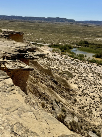 Wir ruckeln weiter über die Piste & in Pablo knarzt und klappert alles. Der Staub der Piste legt sich auf die Scheiben und färbt Pablo in ein zartes greige. Es geht vorbei an bizarren Felsen & ausgetrockneten Flussbetten, verlassenen Hütten und militärischen Einrichtungen. Zwischendurch halten wir immer mal wieder an, laufen zu einem Aussichtspunkt und staunen über diese skurrile Mondlandschaft. Nach knapp 3 Stunden kommen wir wieder am ersten Aussichtspunkt an und gönnen uns eine Pause. Der Wind ist mittlerweile so stark, dass wir unsere Pommes festkleben müssen, damit sie nicht wegfliegen.