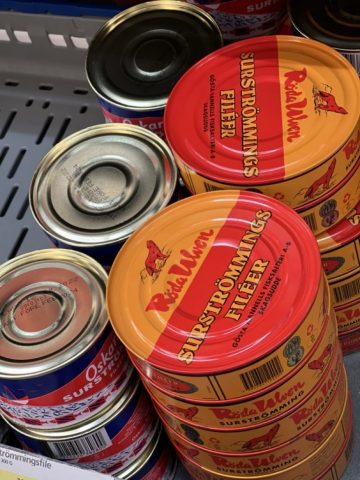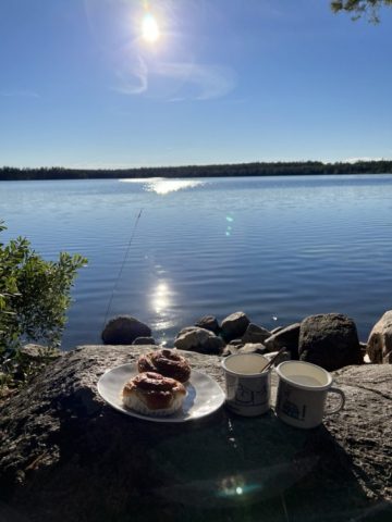 Bei einem kurzen Stopp, um unsere Lebensmittelvorräte aufzufüllen entdecke ich im Kühlregal ein paar Dosen Surströmming und bin versucht sie mitzunehmen. Nicht für uns, aber vielleicht als Souvenir für die Daheimgebliebenen? Unser Magen knurrt und so entscheiden wir uns für eine ausgedehnte Mittagspause in der Sonne- ein einsames Plätzchen mit direktem Seezugang ist schnell gefunden und wir genießen die kurze Auszeit.