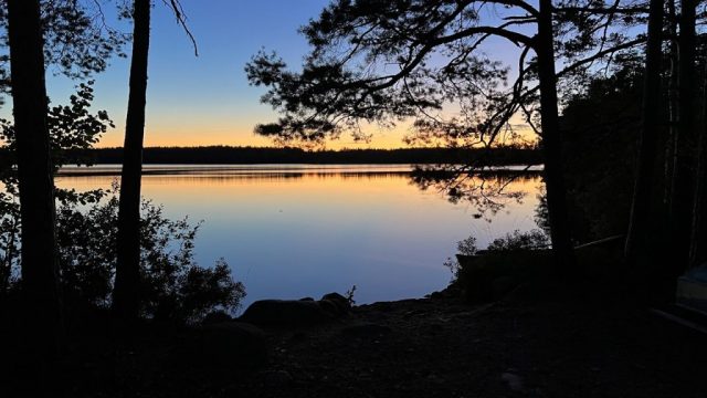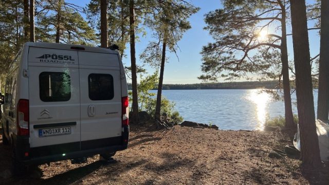 Nach dieser kleinen Stippvisite ist eigentlich Kaffeezeit und da die Sonne so schön vom blauen Himmel lacht, beschließen wir, uns schon einen Stellplatz für die Nacht zu suchen und den Tag gemütlich ausklingen zu lassen. Ein nettes und wirklich einsames Plätzchen ist schnell gefunden. Mitten im Wald und direkt am See. Hier ist wirklich nur Platz für einen Camper und so stehen wir zum ersten Mal seit Beginn unserer Reise ganz allein in der freien Natur. Wir werden für unseren Mut mit einem traumhaften Sonnenuntergang belohnt und kuscheln uns danach gleich mit einer Wärmflasche bewaffnet ins Bettchen, denn die Nächte werden schon merklich kälter. Ein etwas mulmiges Gefühl haben wir schon in der Magengegend, so ganz allein im Wald. Aber auch das gehört zu den Camper-/ Vanlife- Erfahrungen und vielleicht werden wir ja morgen früh ja von einem Elch wachgeküsst.