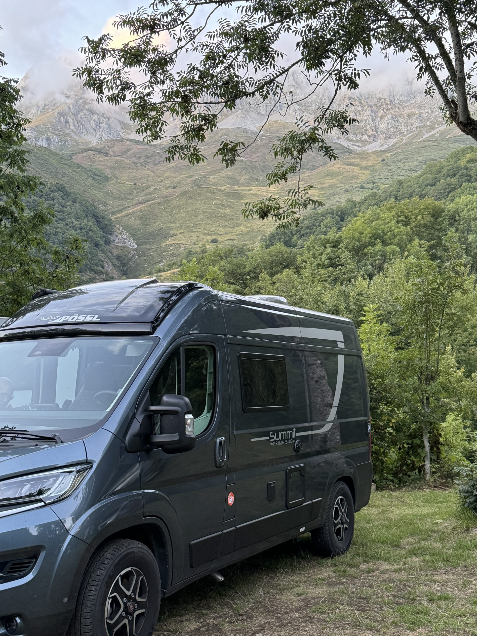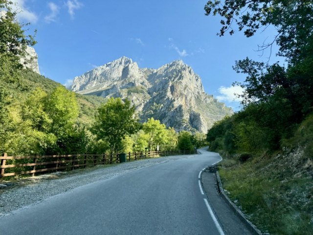Wir haben uns für den Einstieg in Caín entschieden und fahren daher zurück nach Posada de Valdeón. Im Ort angekommen geht es rechts ab- allerdings prangt mal wieder ein „Camper verboten“-Schild vor unserer Nase. Das haben wir allerdings gestern schon entdeckt und nun die Wahl zwischen „ignorieren“ und „versuchen zu umfahren“. Wir entscheiden uns für letzteres und siehe da: Die Straßen sind zwar extrem eng, aber kein Verbots-Schild zu sehen. Also geht es für uns weiter Richtung Ziel: Über enge, kurvige Wege (mit bis zu 20% Steigung und Gefälle), durch verwunschene Wälder und mit wundervollen Aussichten auf die Picos. Begleitet wird das Ganze von Miris durchgehendem Beten, dass uns niemand (genauso beklopptes) entgegen kommt.