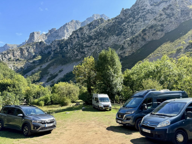 Wir haben geschlafen, wie die Murmeltiere. Außer dem Rauschen des nahegelegenen Flusses und dem Glockenklang der grasenden Kühe war nichts zu hören. Um 8:00 Uhr packen wir Duschzeug und Klopapier ein und laufen durch die Morgensonne und 8 Grad Außentemperatur zur örtlichen Nasszelle. Auf dem Platz herrscht bereits reges Treiben: Die Einen suchen ein sonniges Plätzchen fürs Frühstück, die Anderen gehen den Pflichten rund um den Camper nach. Nachdem Grauwasser entleert, das Chemieklo auf Vordermann, Wasser aufgefüllt und der Strom abgestöpselt ist, rollen wir von den Auffahrkeilen und in Richtung Ruta del cares.