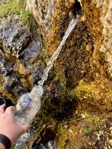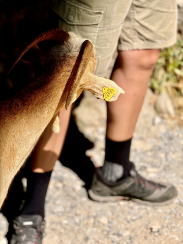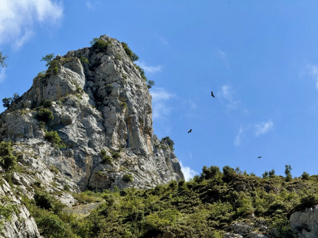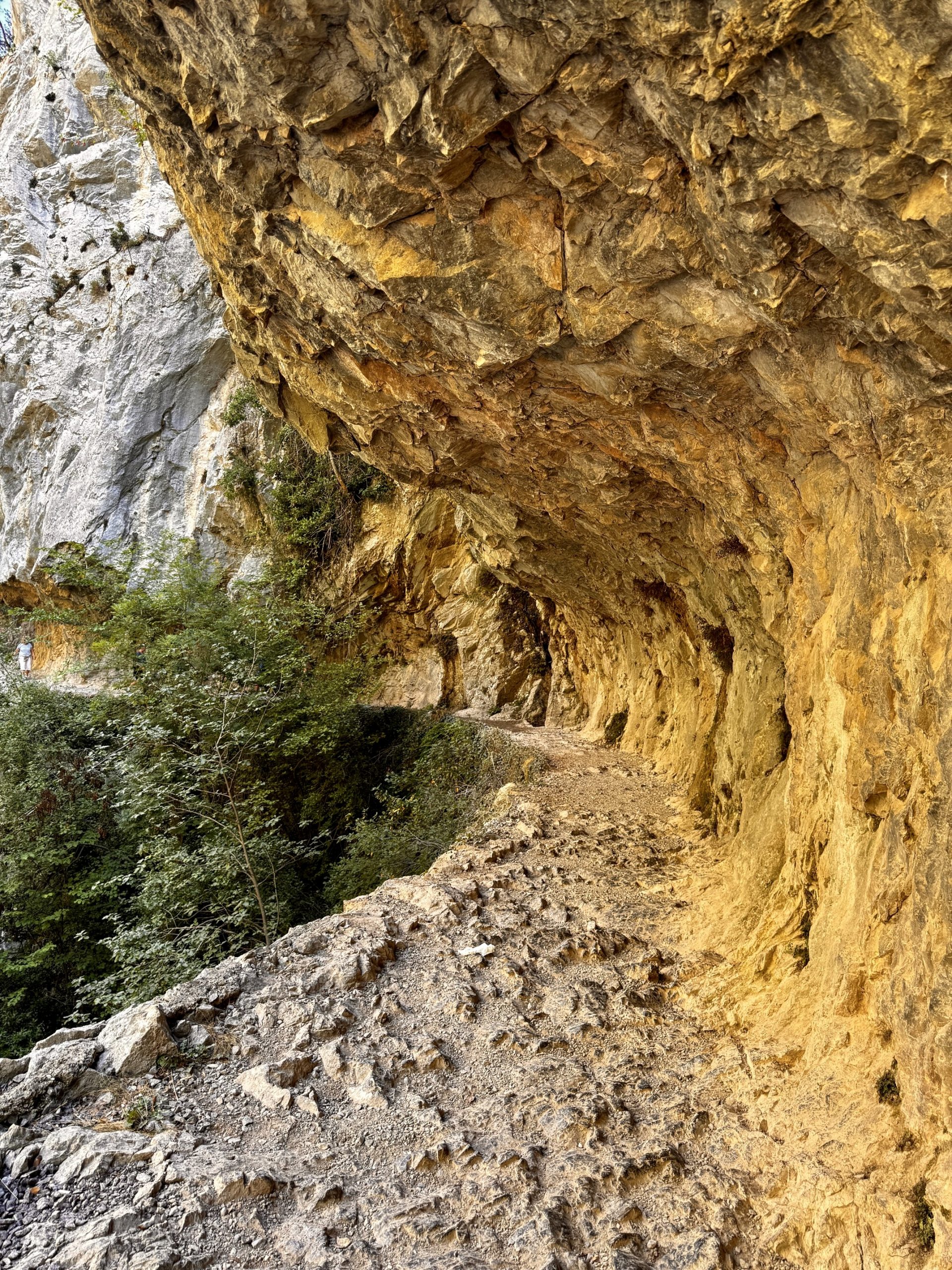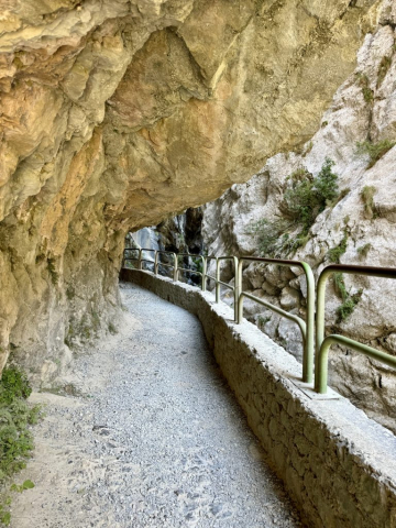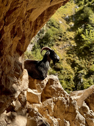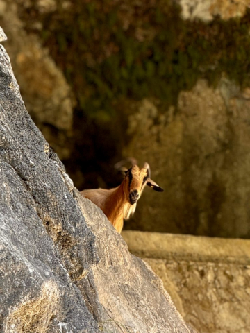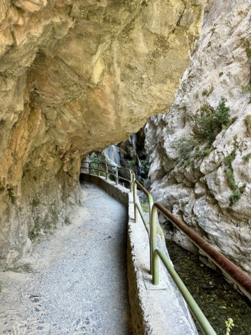 Trainiert sind wir schon lange nicht mehr und daher beschließen wir einfach soweit zu laufen, wie wir kommen und dann umzukehren. Und so führt uns der Weg anfänglich durch den Wald, direkt am Fluss entlang, der sich schnell zum reißenden Bach entwickelt. Es geht weiter über Brücken und geduckt durch enge Tunnel. Ziegen liegen entspannt am Weg, ab und an huscht ein Salamander vorbei und hoch oben in den Gipfeln kreisen die Gänsegeier. Der Weg ist so atemberaubend, dass wir schnell bei Kilometer 5 angekommen sind. Da wir noch Energie für den Rückweg brauchen, machen wir Mittagspause und entscheiden uns dann umzukehren. Die Sonne sticht mittlerweile und wir sind froh diese Entscheidung getroffen zu haben!