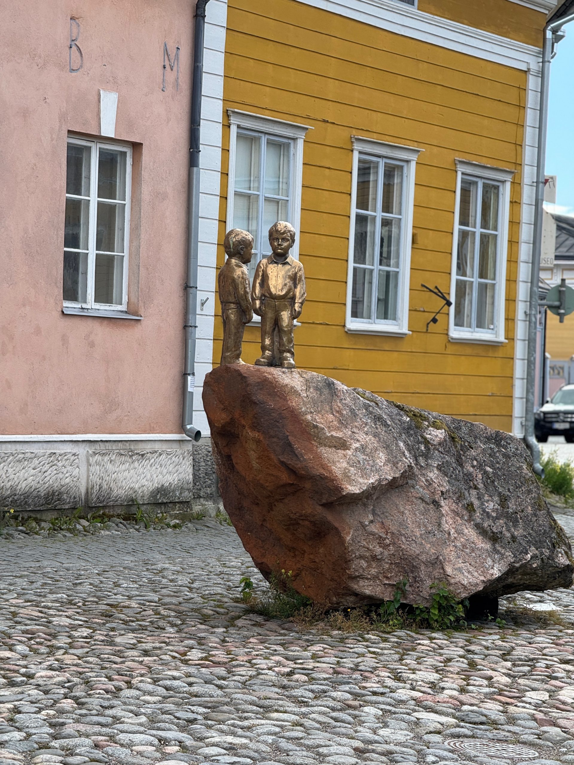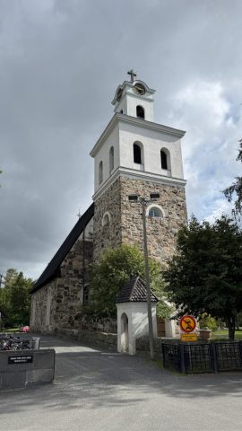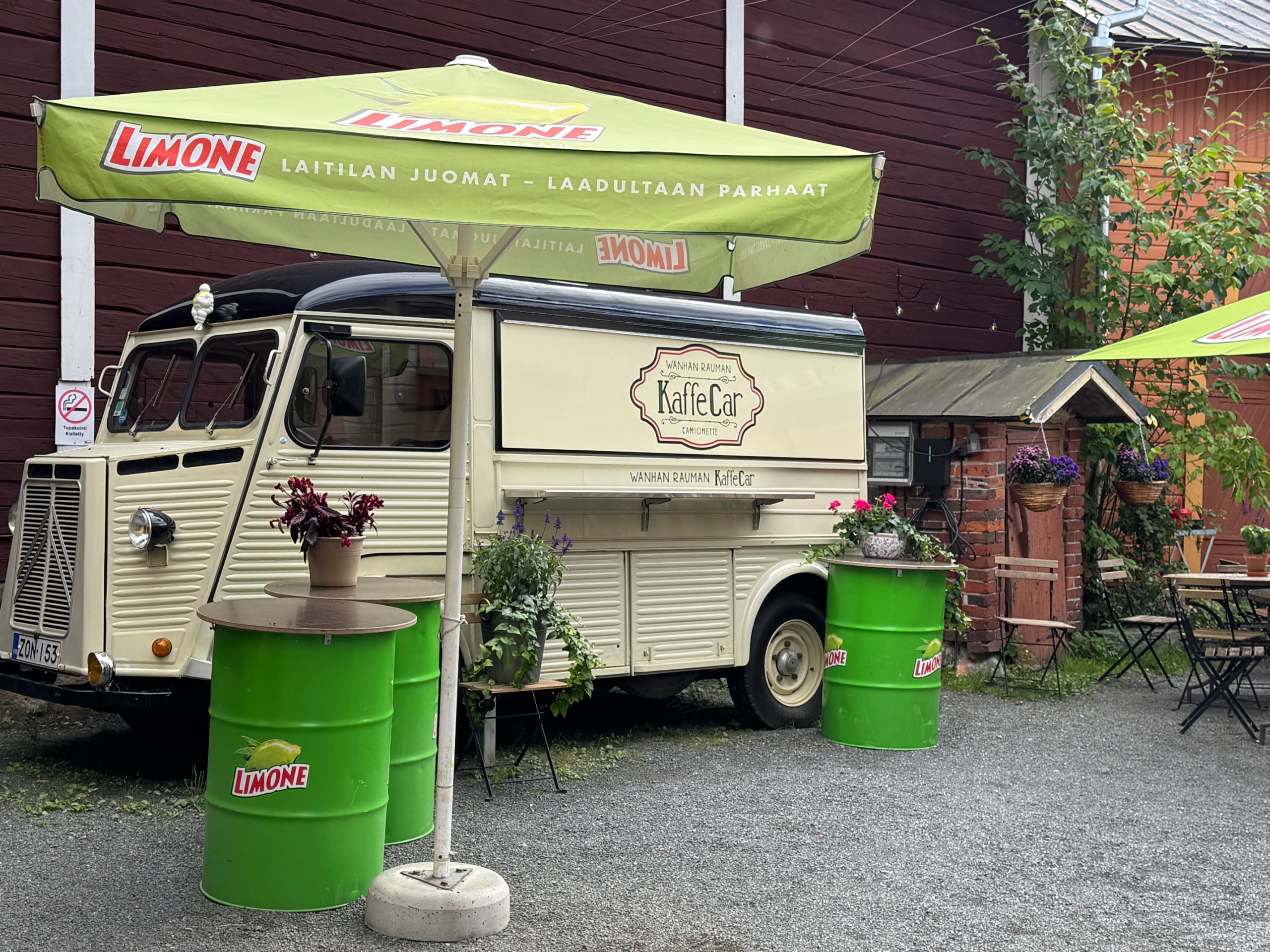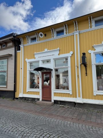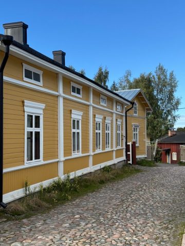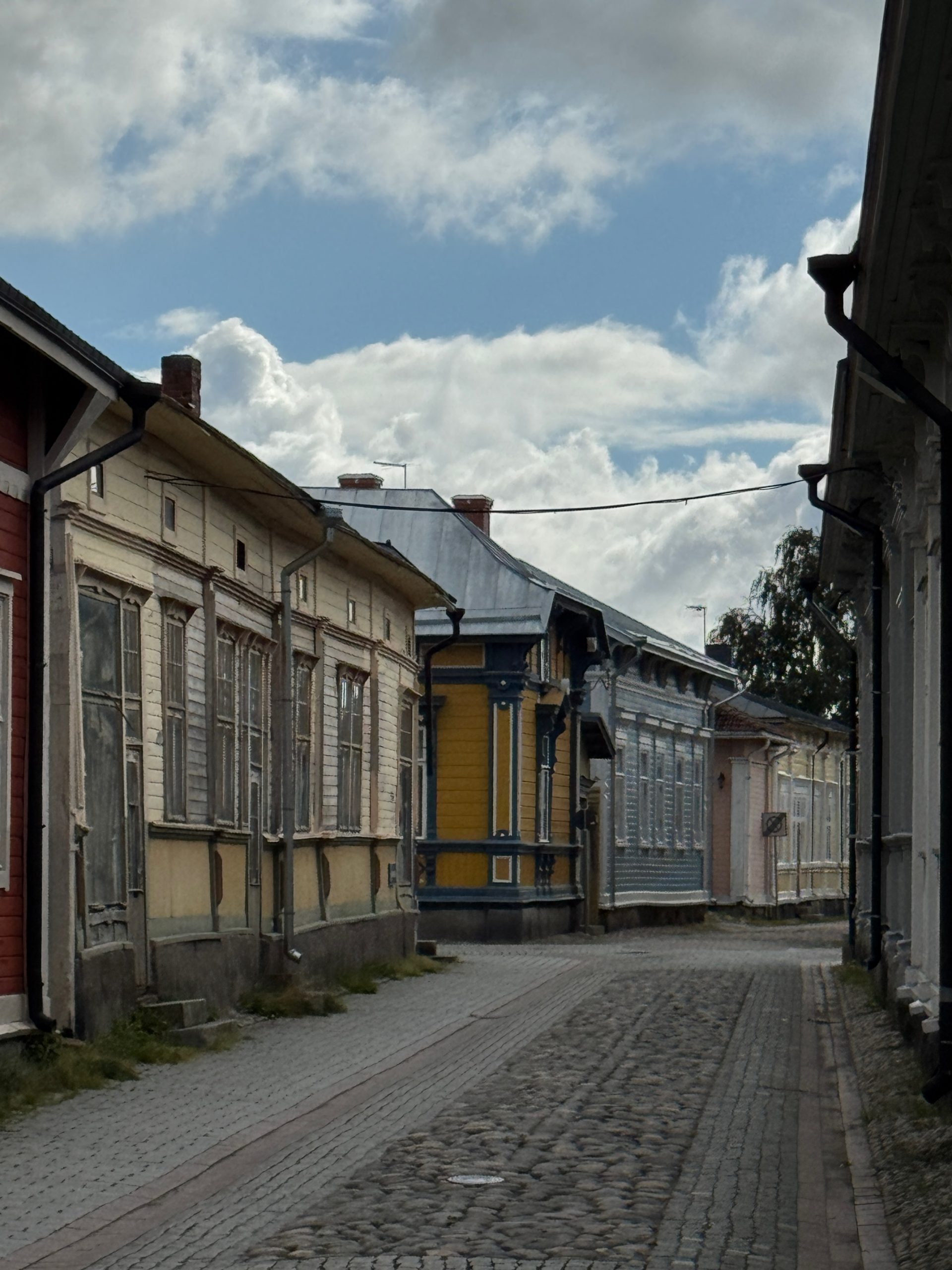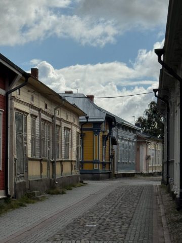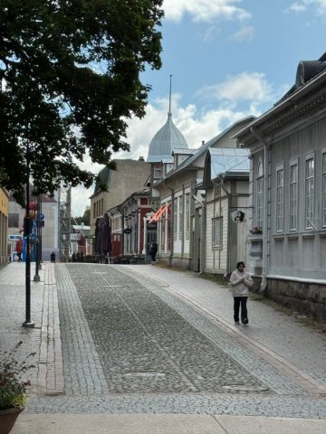 Wir sitzen am Meer und die Sonne wärmt uns, während unsere Stellplatznachbarn (eine Familie mit zwei Kindern, die recht spartanisch unterwegs sind), ihre Morgenroutine im Fjord erledigen. Das Wasser scheint frostig und wir amüsieren uns über das Gequieke und Gequake! Wir verzichten auf ein erfrischendes Bad und machen uns gegen Mittag auf den Weg nach Rauma, eine der ältesten Städte in Finnland. Vom Schicksal vieler Holzstädte im Norden wurde Rauma zum Glück nicht ereilt – den letzten Großbrand gab es 1640 und so sind die ca. 600 bunten Holz-Häuser teilweise mehr als 350 Jahre alt.