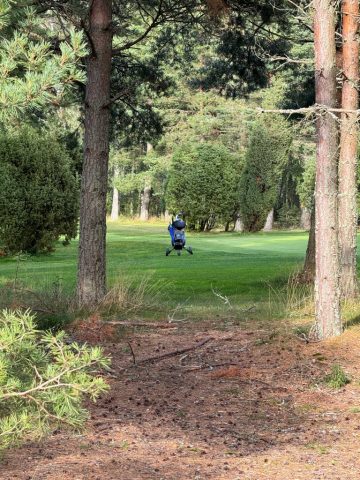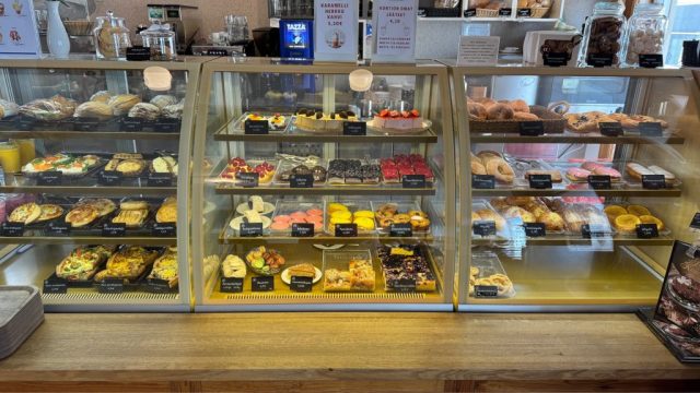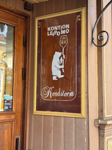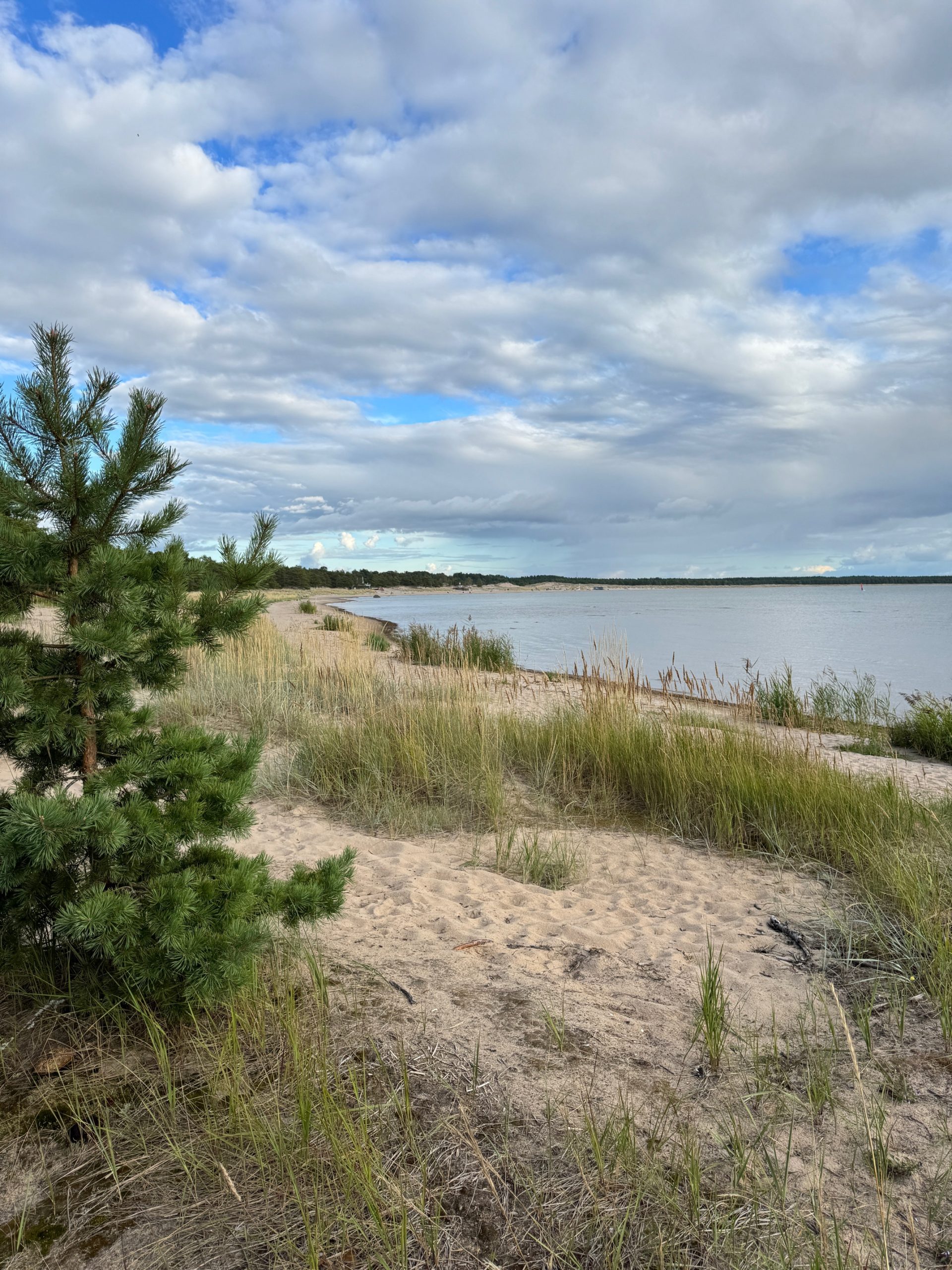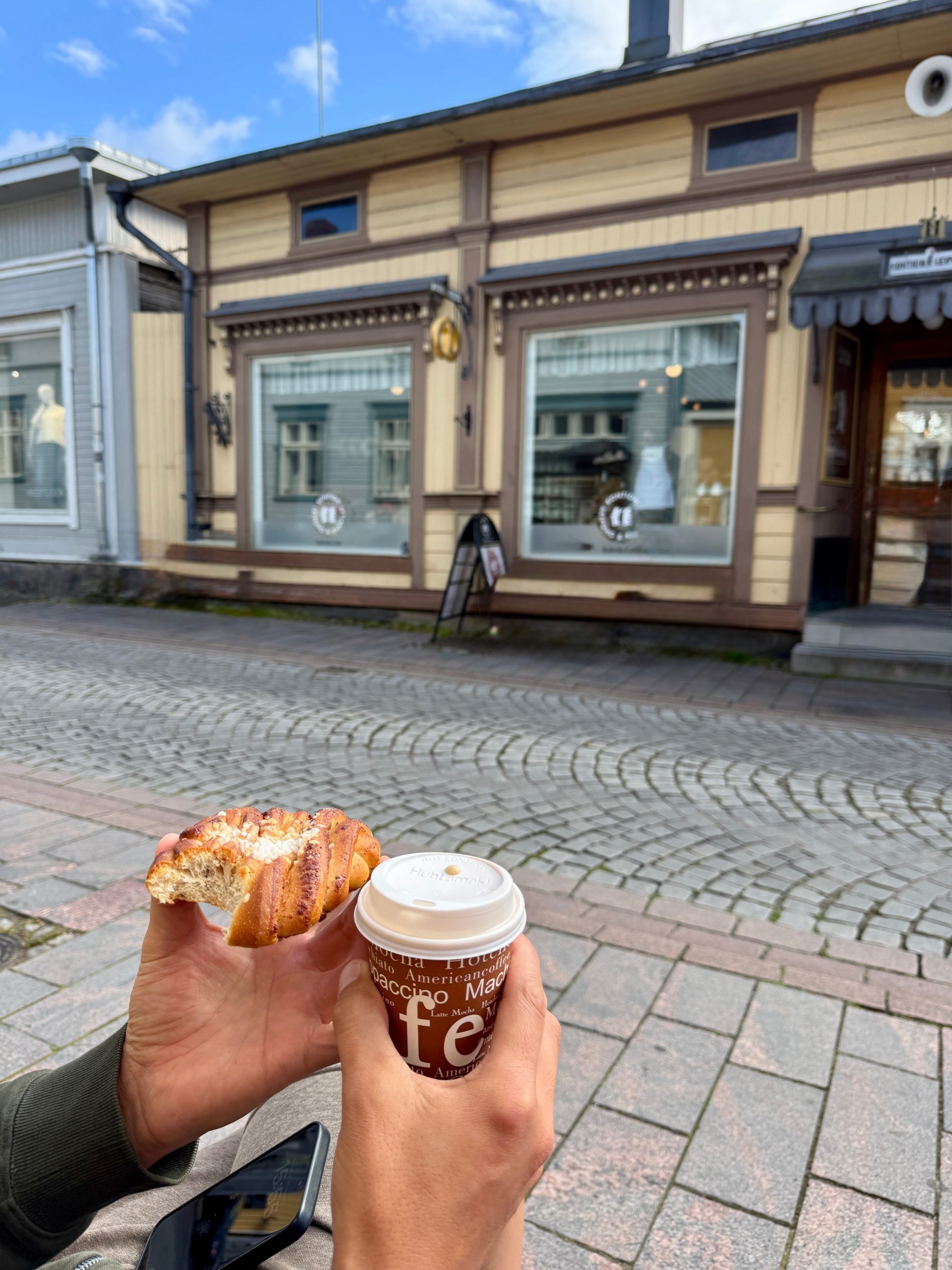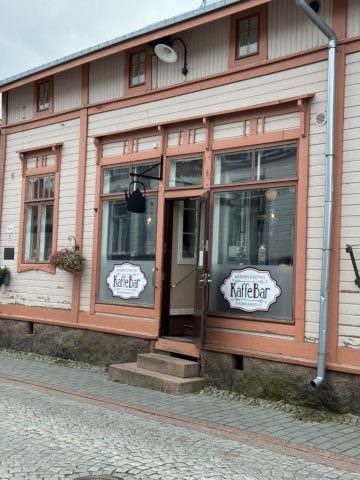 In einem Schaufenster zieht uns ein Bär dann in seinen Bann! Er lockt mit frischem Gebäck und ebenfalls herrlichem Kaffeeduft. Jetzt können wir nicht widerstehen: Marco reserviert die Bank in der Sonne und ich besorge Kaffe und „Pulla“, die finnischen Zimtschnecken. Gestärkt und glücklich laufen wir zum Parkplatz zurück und entscheiden uns den nächsten Stellplatz anzufahren. Marco hat schon einen ausfindig gemacht: am Meer und wieder direkt am Golfplatz (scheint diesmal irgend so ein Ding zu sein).