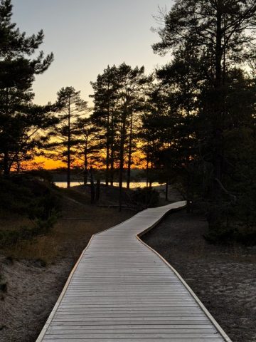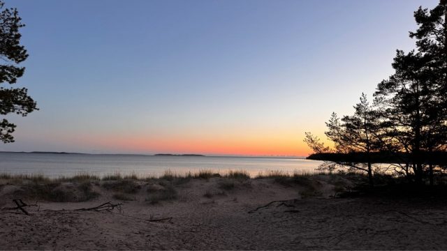 Pünktlich zum Sonnenuntergang geht’s noch mal zum Spaziergang an den Strand. Die Farben am Himmel reichen von orange- bis rosarot, aber es ist kalt und die Attacken der Stechviecher nehmen immer mehr zu. Also nehmen wir den Rückweg über die Stege durch den Wald und kommen durchgefroren bei Ragnar an. Marco hatte sowas wohl schon vermutet und vorher die Heizung angestellt. Eine finnische Sauna ist im Vergleich zu dem, was uns jetzt erwartet, allerdings eine Kühlkammer. „Heizung aus und Fenster auf“ sagt mein Reflex! Allerdings besinne ich mich wieder, denn es gibt schon genug Mückenstiche zu versorgen. Wir sitzen also die Hitze aus und behandeln unsere geschundene Haut.