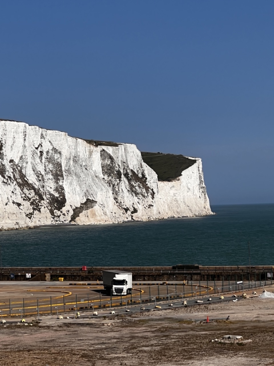 Zum Glück müssen wir uns nicht stressen und können noch mal gemütlich an der Küste entlangfahren, unterwegs noch ein paar englische Leckereien einkaufen und dann im Hafen einchecken. So der Plan! Bis Miri zufällig noch mal die Abfahrtzeit der Fähre checkt: Da steht nicht 17:00, sondern 14:30 Uhr…. Zwei Stunden Fahrt bis nach Dover, tanken, kurz einkaufen und bis 12:30 Uhr im Hafen sein: Nachdem wir alles durchgerechnet haben und das Gefühl der Panik verflogen ist, sind wir froh, dass wir so früh aufgestanden sind. Wir atmen durch und fahren los. Der Berufsverkehr verlagert sich auf die Hauptstrecken und wir kommen ohne Stau durch die kleinen Orte an der Küste. Allerdings ist nicht viel zu sehen.