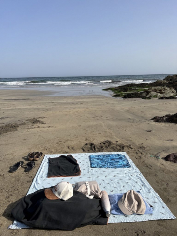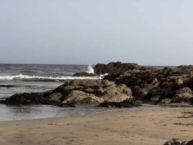 Zwischendurch werden wir noch von einem kleinen, frechen Vierbeiner als Spielzeug missbraucht, der scheint uns mit den Felsen zu verwechseln und watschelt einfach mal über uns drüber. Seinem Frauchen ist das sichtlich peinlich, für uns aber nur ein Grund nochmal in die Wellen einzutauchen und den Sand abzuspülen.