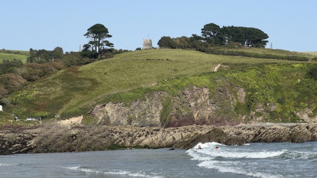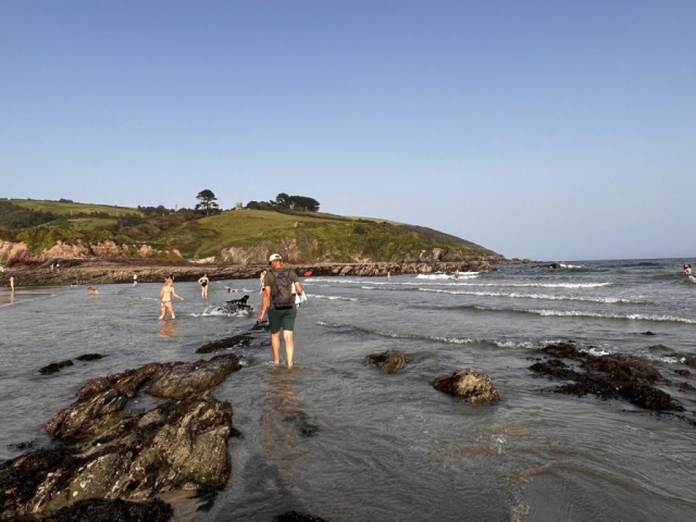 Ok, wenn man sich an den Geruch gewöhnt hat, ist die Bucht eigentlich ganz schön: Die Felsen, die ins Meer ragen, haben wunderschöne Farben, die Wellen peitschen dagegen und oberhalb der Felsen stehen kleine cornische Herrenhäuser und Schafe grasen vor einer alten Kirche. Wir laufen in Richtung Meer und suchen uns eine ruhige Ecke zwischen den Felsen. „Wie schön ist es hier, bitte?“ Während wir die Kinder und Hunde beim Wellenreiten beobachten, genießen unsere selbst gemachten Sandwiches und stürzen uns sogar in die eiskalten Fluten.