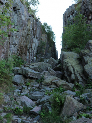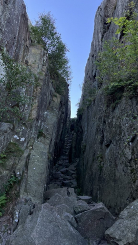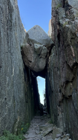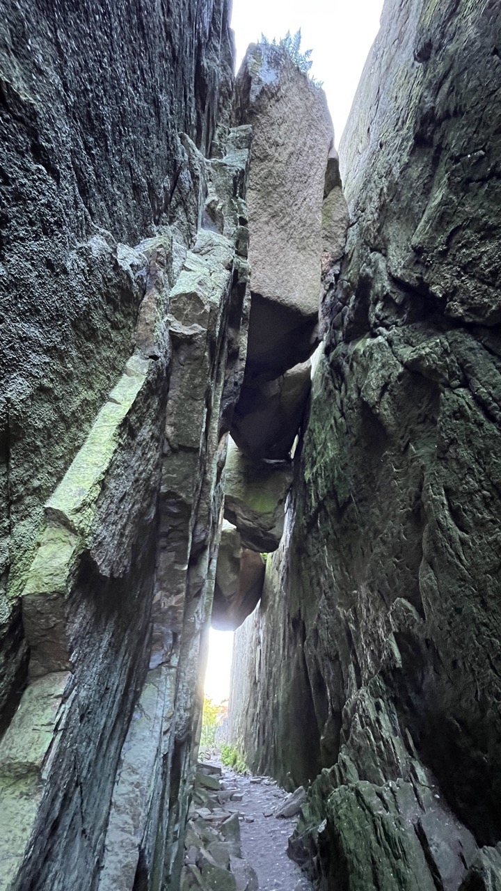 Wir denken uns nichts dabei. Zum Glück haben wir vorher nicht gelesen, was uns erwartet, denn sonst wären wir wahrscheinlich im Ort geblieben. Vor uns tut sich ein Steinhaufen auf. Das soll ein ausgewiesener Wanderweg sein? O.k., wir sind ja beide Steinböcke- also kraxeln wir hoch. Oben angekommen stehen wir zwischen den Felsspalten, der Weg ist weiter von Steinbrocken gepflastert, die wohl im Laufe der Jahrhunderte heruntergestürzt sind. Langsam verstehen wir das Warnschild! Aber die Neugier treibt uns weiter und wir werden dafür belohnt. Es wird dunkler auf unserem Weg, was wahrscheinlich an den 4 Felsbrocken liegt, die über uns in der Spalte stecken.