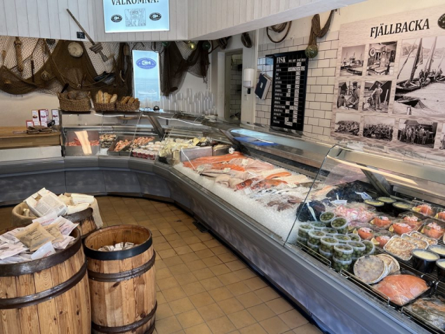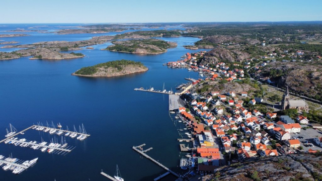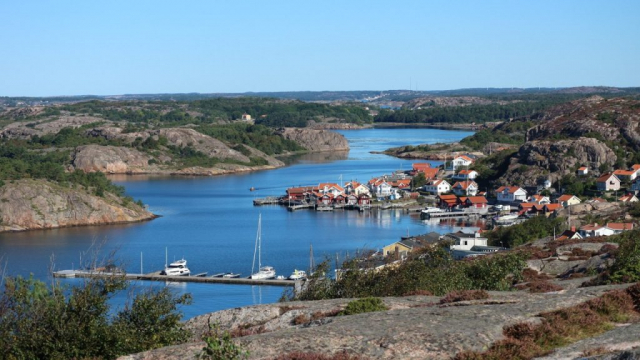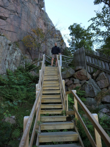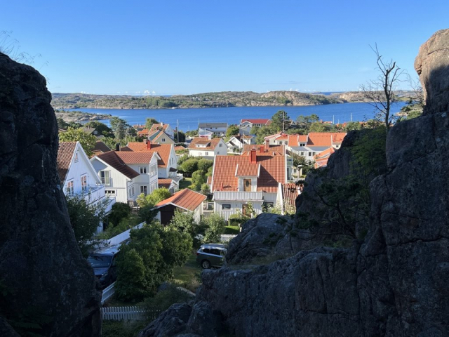 Am Ende der Klamm erwarten uns wieder ein paar Holztreppen, die nach oben führen und oben angekommen werden wir mit einer herrlichen Aussicht auf Fjällbacka und die umliegenden Schärengärten belohnt. Hier könnte man ewig verweilen, nur dumm, dass unser Parkticket bald abläuft und so machen wir uns schweren Herzens auf den Rückweg. Im Ort stocken wir noch unseren Fischvorrat auf, da unsere Reiseroute ab heute ins Landesinnere führt.
