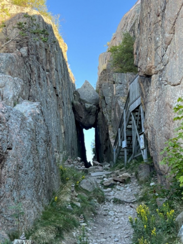 Aber hier gibt es noch etwas Besonderes: Wir starten eine kleine Wanderung durch die Kungsklyftan, die Felsspalte, die den Ort in zwei ungleiche Hälften teilt.