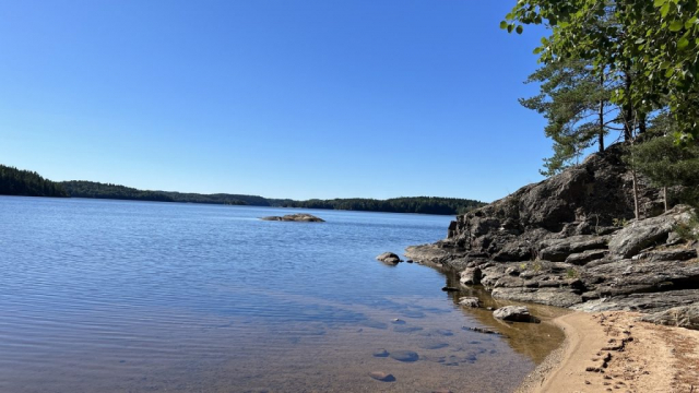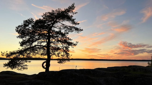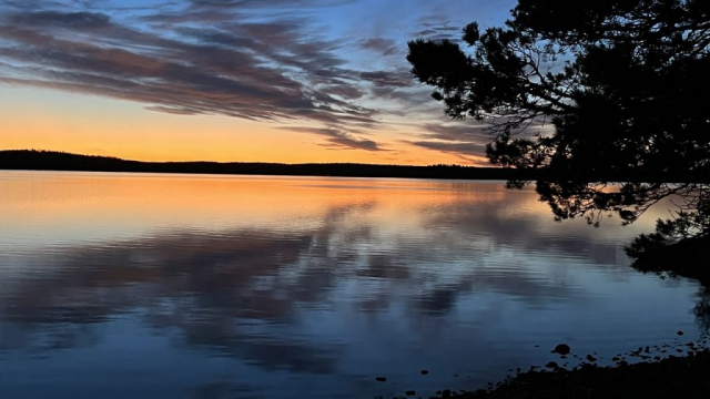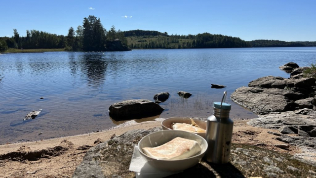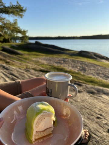 Wir fahren weiter, den. Ich habe einen schönen Stellplatz am See gefunden. Vorher lotse ich Marco noch durch einsame Waldtrassen, statt den direkten Weg über die E18 zu nehmen. Vielleicht sehen wir ja endlich mal einen Elch. Aber die Chancen sind hier so hoch, wie bei uns die Wahrscheinlichkeit einfach mal einen Wolf im Wald zu treffen. Wir finden den abgelegenen Stellplatz direkt am See und genießen Kaffee und (gekaufte) Princesstårta mit Blick auf die untergehende Sonne! Wer braucht schon ein Café in der Stadt, bei so einer Aussicht?