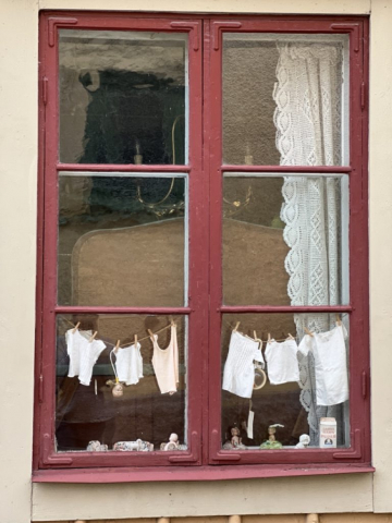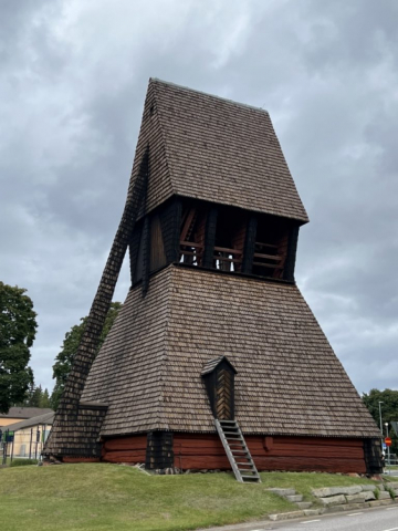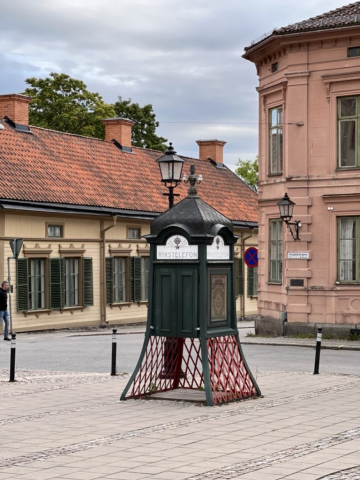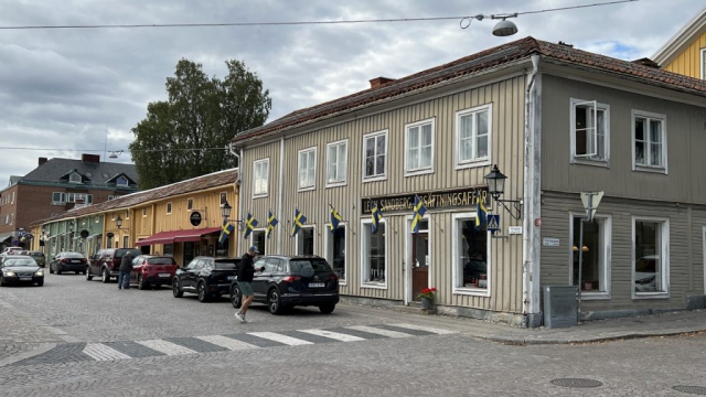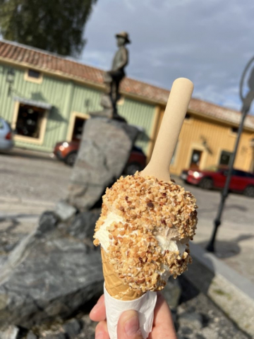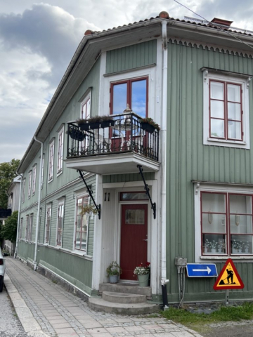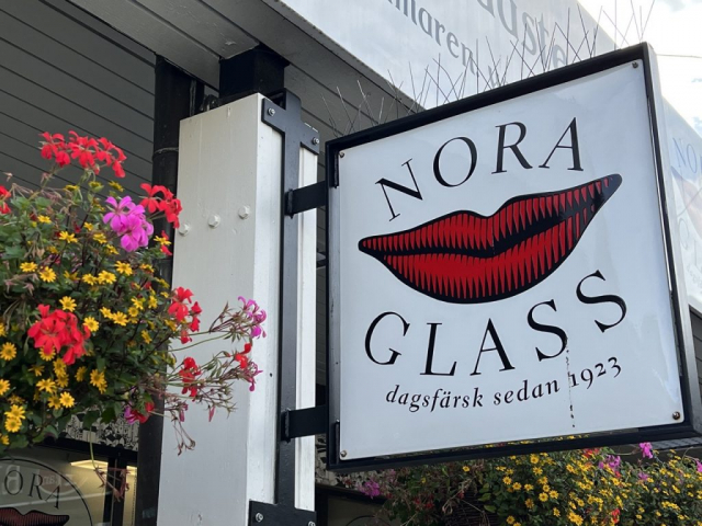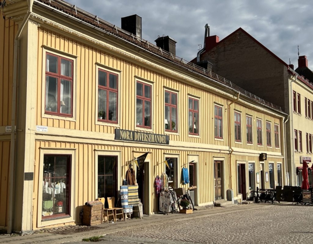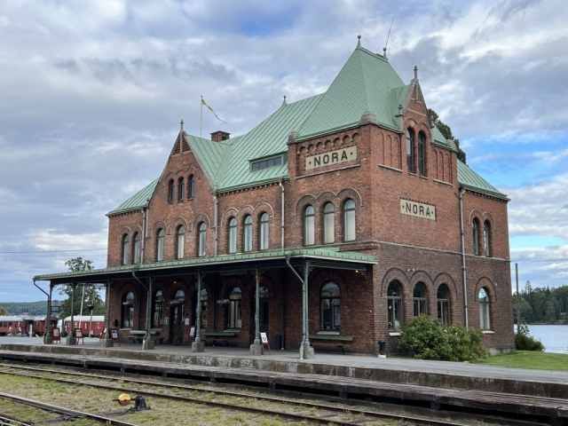 Gegen 15:00 Uhr kommen wir in Nora an. Ich bin mir unsicher welches Jahr wir haben, der ganze Ort versprüht den Charme von 1922: Alte Holzhäuser, die (teilweise) ihre besten Zeiten schon hinter sich haben, krumm und schief. Selbst die Schaufenster, die wir bei einem Bummel durch die Stadt betrachten, versprühen den Flair des letzten Jahrhunderts. Kein Wunder, denn Nora zählt zu den best-erhaltenen Holzstädtchen Schwedens und watet nebenbei noch mit einem landesweit gerühmten Eis auf. Davon gönnen wir uns natürlich eine Portion. Es gibt allerdings nur drei Sorten: Vanille, Haselnuss und die Sorte des Tages (heute ist es weiße Schokolade mit Himbeeren).Während wir das gute Eis genießen, schlendern wir Richtung Bahnhof. Hier wurde 1856 die erste schwedische Eisenbahnstrecke mit Normalspur eingeweiht.