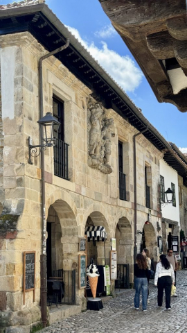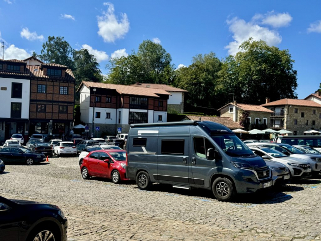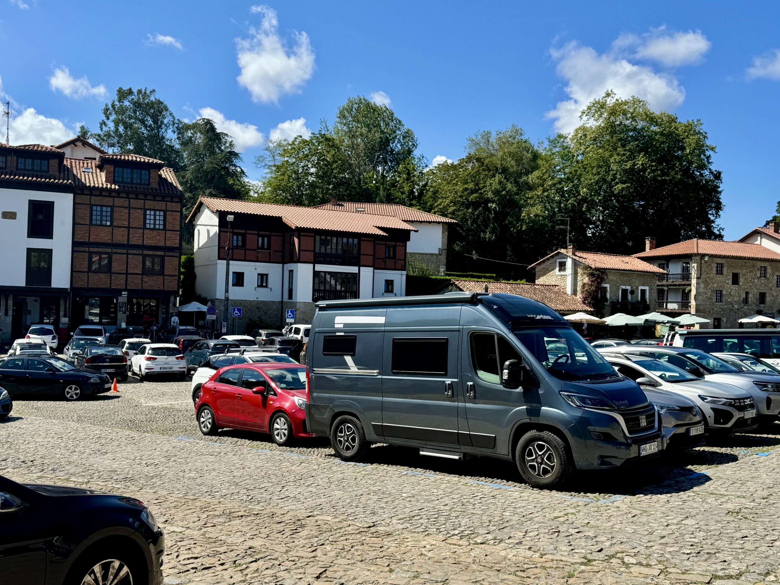 Aber es hilft alles nichts, der Parkplatzgott hat kein Erbarmen und so fahren wir weiter nach Santilliana del Mar. Sie wird als Stadt der drei Lügen bezeichnet, da sie weder heilig, noch flach ist und auch nicht am Meer liegt. Letzteres bezieht sich jedoch auf die Stadt, denn die Gemeinde hat eine Küste. Hier ist auch viel los, allerdings ist es nicht so schlimm wie in der Stadt. Wir scheinen doch „Dorfkinder“ zu sein. Wir haben Glück und bekommen einen guten Platz, sogar zentral am „centro histórico“. Da wir unsicher sind, ob wir hier parken dürfen, frage ich die fleißige Politesse vor Ort in gebrochenem Spanisch und bekomme ein „esta bien“ zur Antwort. Perfekt, wir ziehen los und sind gespannt, was die Stadt zu bieten hat.
