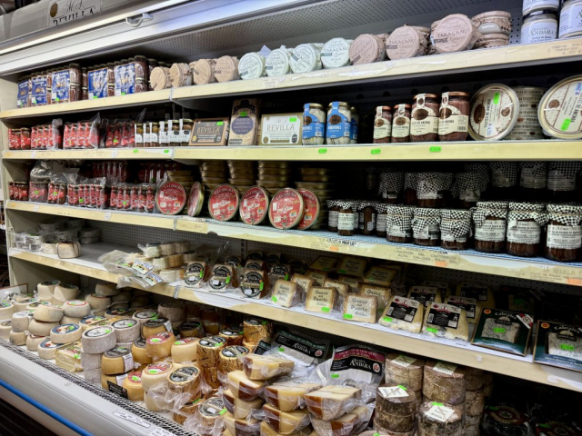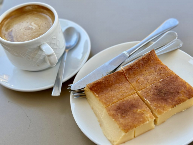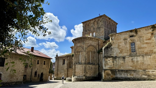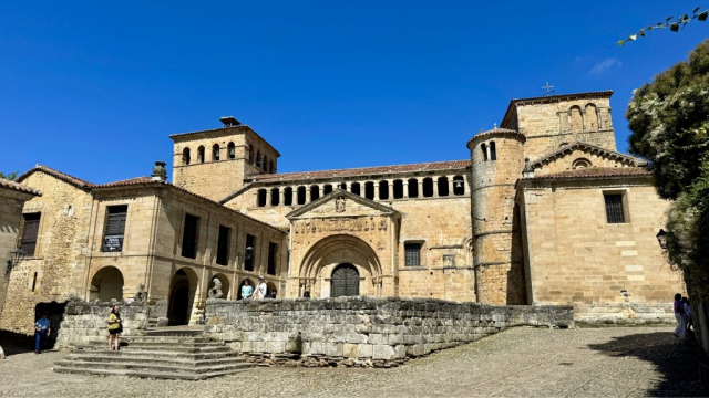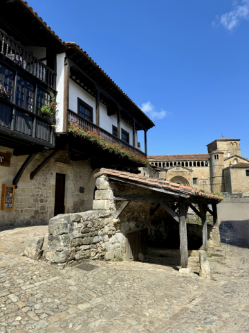 Wir schlendern durch die Gassen und ich kaufe ein paar Kleinigkeiten ein. Santilliana ist bekannt für seine Käsespezialitäten und so gibt es an jeder Ecke Delikatessen. Ich kaufe im Casa Angel den bekannten Kuchen, denn man sagt hier sprichwörtlich: „Wer kein Glas Milch und keinen Quesada hat, wird nicht heiraten!“ stellt Euch mal vor, Marco lässt sich deswegen scheiden und ich komme nirgends mehr hin? Am „Ende“ der Altstadt trohnt die Stiftskirche Colegiata de Santilliana del Mar. Leider können wir sie nicht besichtigen, aber sie bietet Schatten und das kleine Café unterhalb lädt zur Kaffeepause ein.