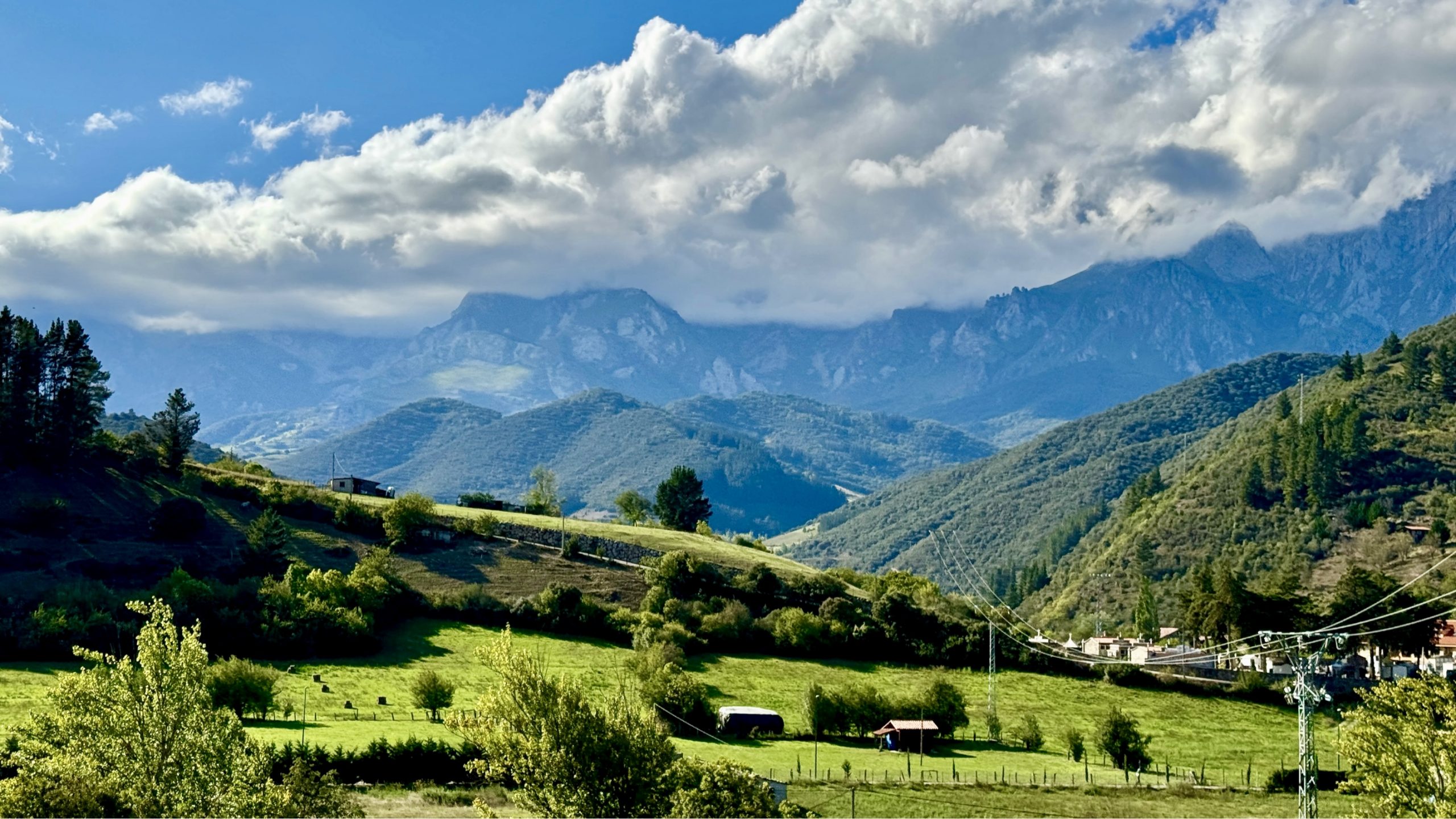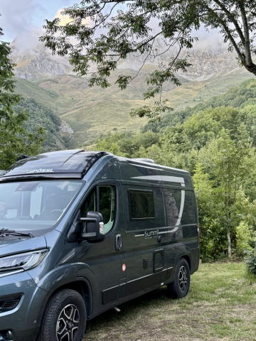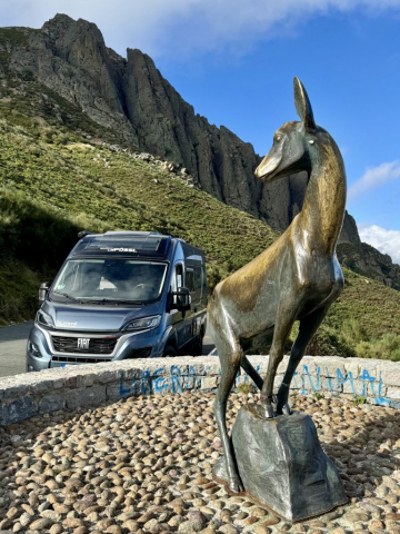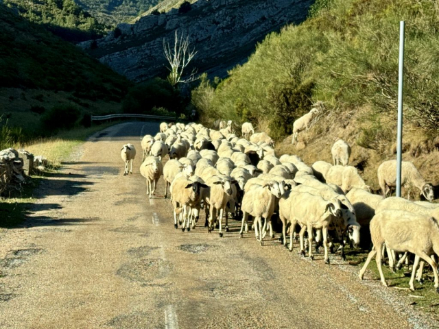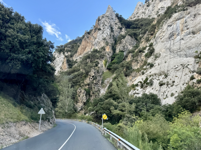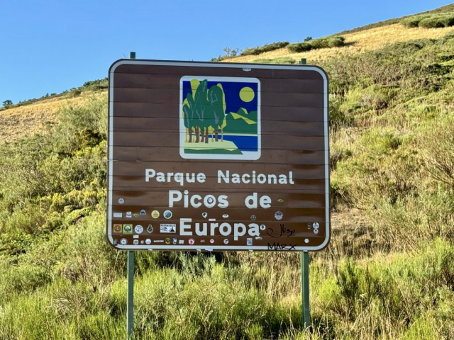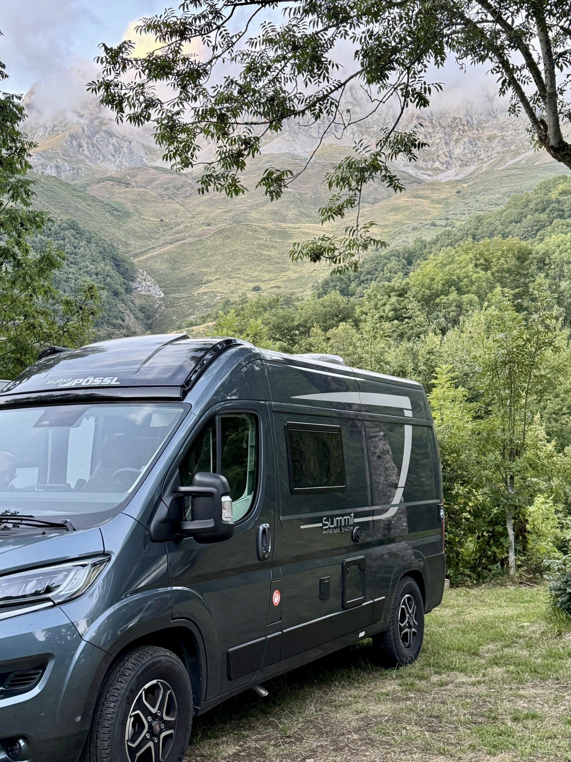 Danach geht es zurück zum Auto. Wir ziehen heute noch weiter in die Picos de Europa. Zuerst Berge, dann Meer: es ist für jeden was geboten. Wir wollen bis Posada de Valdeón, denn für morgen habe ich eine besondere Unternehmung auf meiner Liste stehen. Dafür durchqueren wir (gefühlt) zuerst die Alpen, dann das Allgäu und schlussendlich die Dolomiten. Die Felsformationen und Aussichten sind so beeindruckend, dass wir uns während der Fahrt die Nase an der Frontscheibe platt drücken. Zwischendurch kommen wir durch kleine Bergdörfer, werden von einer Herde Schafe ausgebremst und es ist immer wieder ein „Ooooh“ oder „Aah, wie schön“ zu hören. Zum Glück habe ich vor Ort schon die Stellplätze sondiert und den Gemeinde-Platz für die Nacht ausgewählt. Er kostet zwar 15€ pro Nacht, allerdings sind Strom, Wasser und Abwasser inklusive & Duschen und Waschmaschinen gibt es auch. Das Allerbeste dran ist allerdings die Aussicht: die hohen, zackigen und sonnenbestrahlten Gipfel der Picos de Europa.
