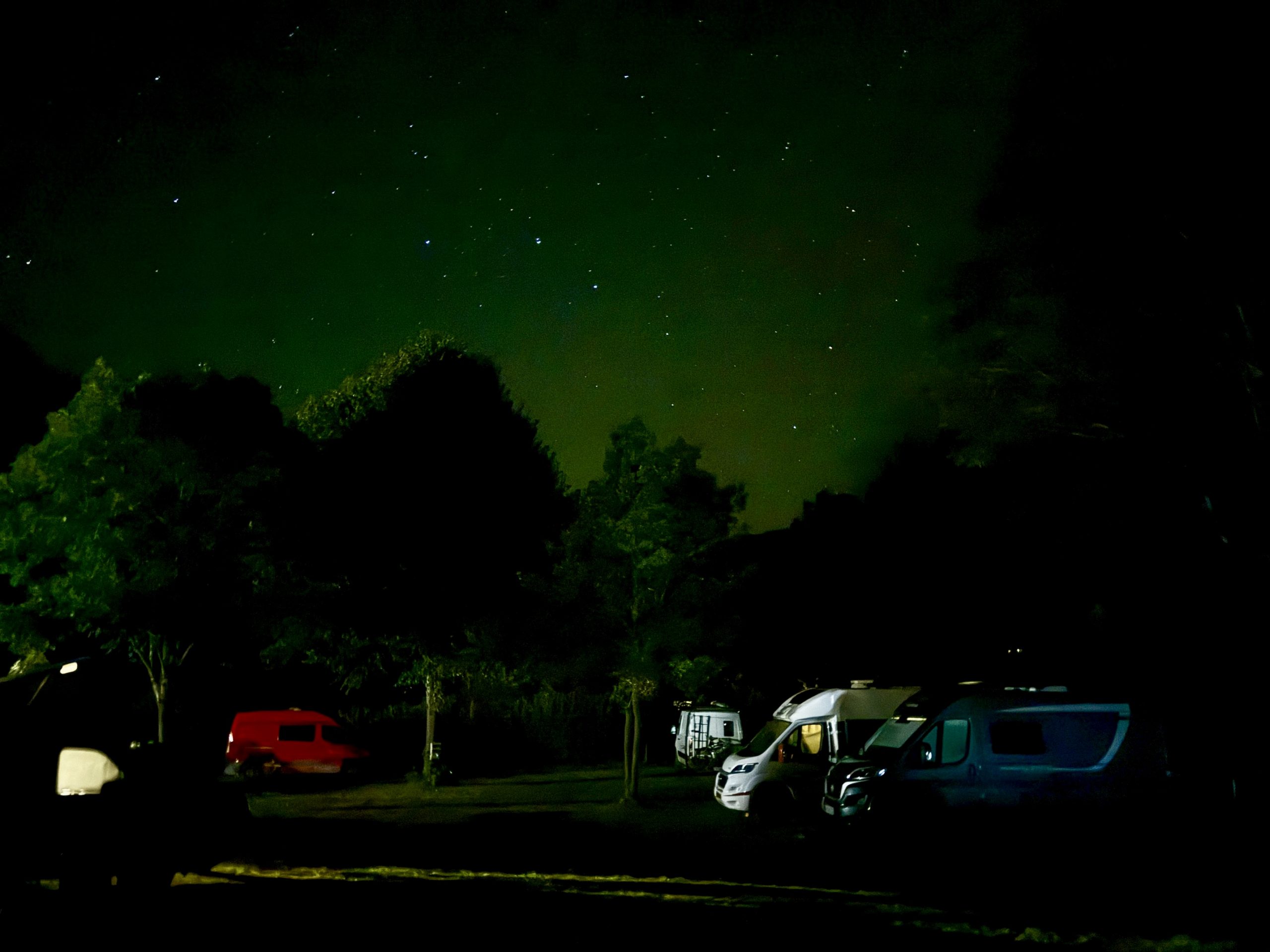 Hier ist es definitiv ruhiger & der Platz hat die selben Annehmlichkeiten, wie der im Ort. Mit dem Unterschied, dass wir mitten im Wald stehen und hier höchstens die Käuzchen „singen“. Ob wir morgen singen, japsen, fluchen oder frustriert umdrehen müssen, wird sich zeigen. Vorher schließen wir diesen sehr gelungenen Tag mit einer weiteren Camperlektion: „Wenn Du auf dem Campingplatz bist, habe immer eine Rolle Toilettenpapier bei Dir, wer weiß wozu Du sie brauchen wirst!“
