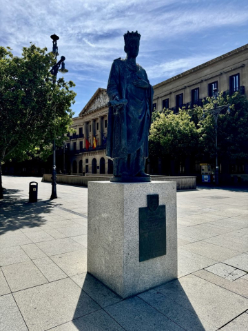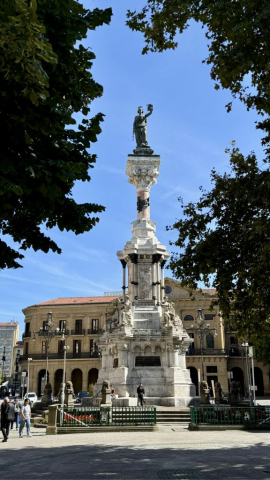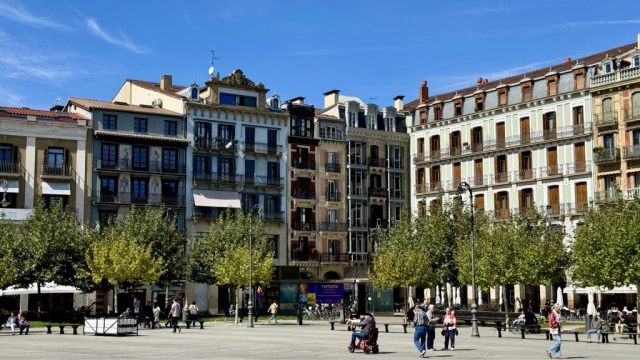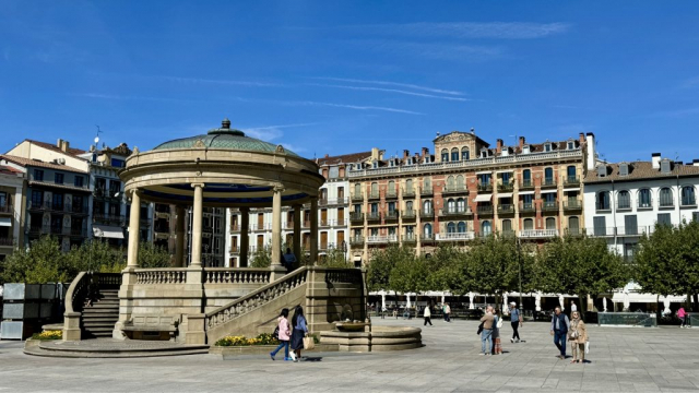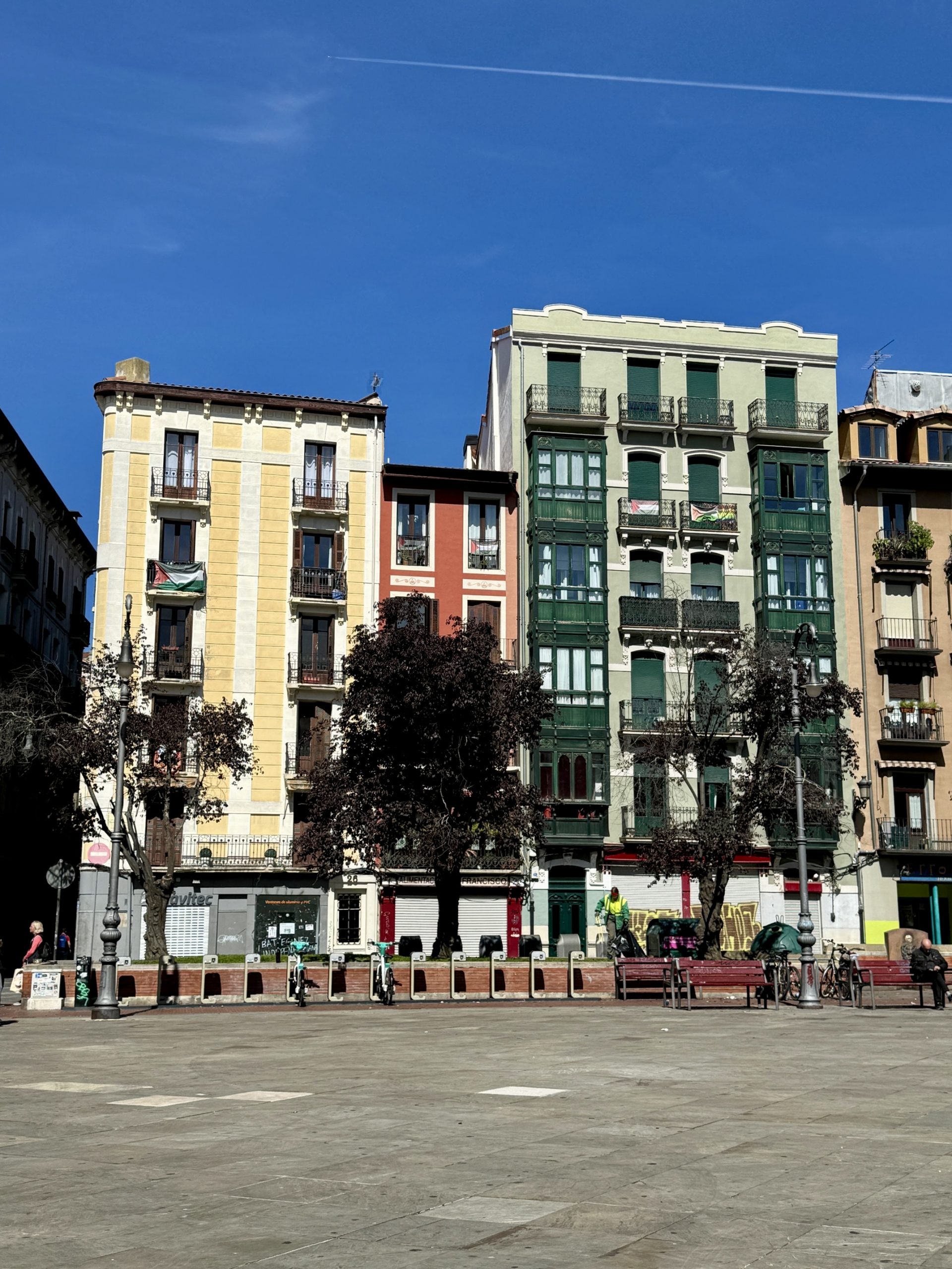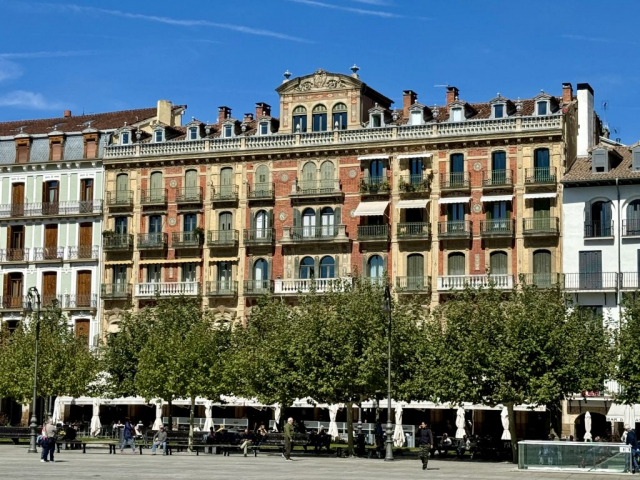Der Busbahnhof liegt unterhalb der Zitadelle Pamplonas – eine nicht wirklich Vertrauen erweckende Gegend. Nach ein paar Minuten erreichen wir das „Centro Histórico“. Am „Monumento a los Fueros“ vorbei geht es zum „Plaza del castillo“, dem Herz der Stadt. Er diente bis zum Ende des 19. Jahrhunderts als Stierkampfarena.