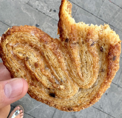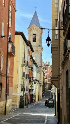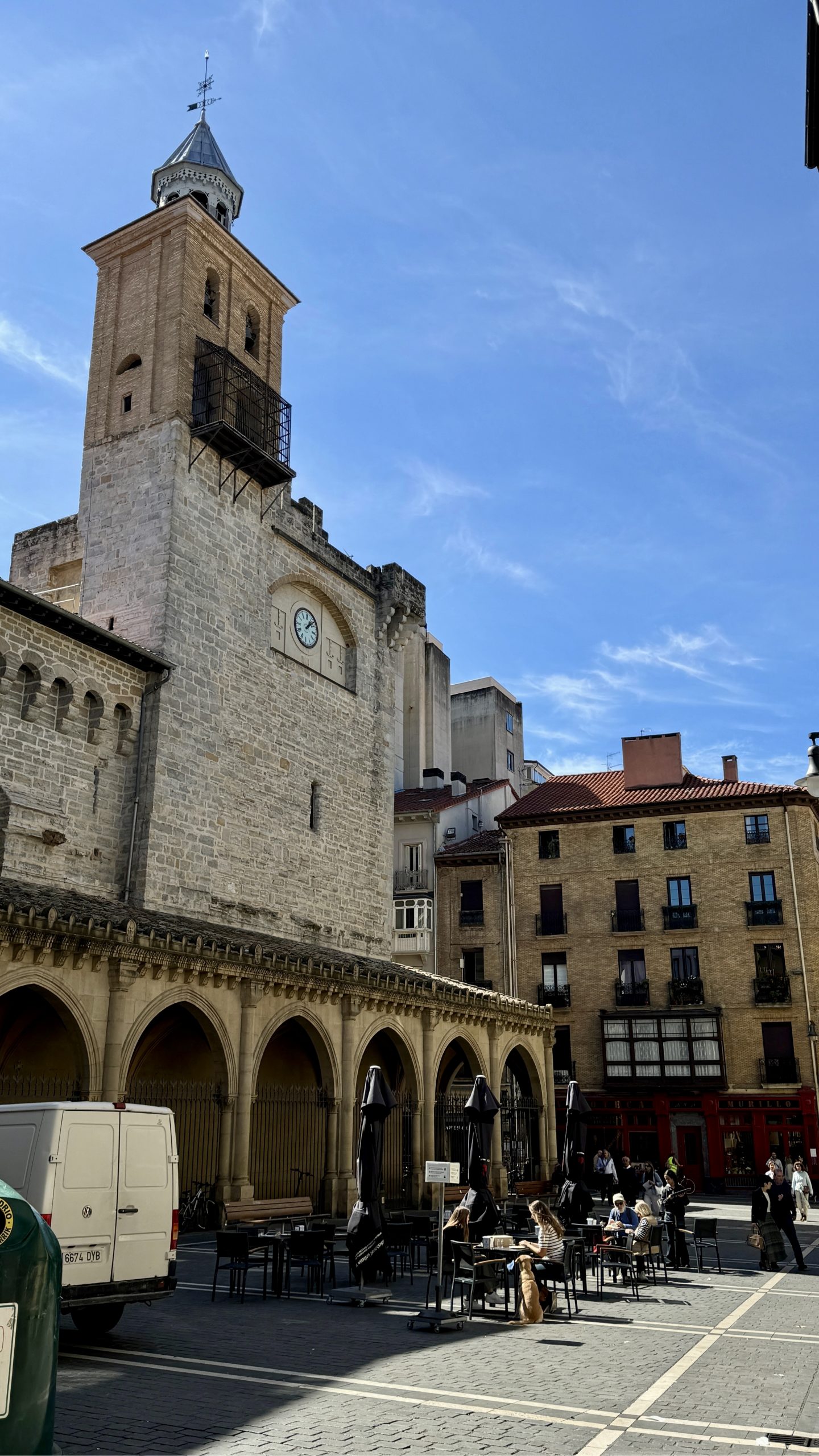 Irgendwann kommen wir am Plaza Constistoral mit dem reicht verzierten Rathaus von Pamplona an. Um die Ecke erstreckt sich die „Calle Mayor“, die Fußgängerzone von Pamplona. Da unser Magen mittlerweile unüberhörbar knurrt, kaufe ich in einer kleinen Bäckerei ein paar süße Köstlichkeiten. Die Bocadillos im Schaufenster der Metzgerei nebenan sehen zwar auch verführerisch aus, aber vielleicht finden wir unterwegs noch eine gemütliche Tapas-Bar. Also ziehen wir schlemmend weiter zur Kathedrale von Pamplona. Davor kniet ein Bettler und ich bekomme ein schlechtes Gewissen so schmatzend vor ihm zu stehen. Also ziehe ich ein Palmerita („Schweinsohr“) aus meiner Tüte und gebe es ihm. Er bedankt sich überschwänglich & ich muss an meinen Opa denken, dessen Lieblingsgebäck „Schweinsohren“ waren.